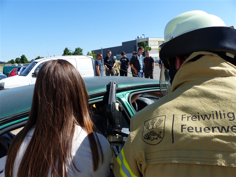 Als Highlight fand sich die Projektgruppe am Donnerstag Vormittag auf dem Gelände der Fa. Huckepack Wiek ein. Hier demonstrierten wir an einem bereitgestellten PKW die patientengerechte Rettung. Die Schüler hatten so die Möglichkeit, sich in die Rolle einer zu rettenden Person zu versetzen, während um sie herum Teile des Fahrzeug mit schweren hydraulischen Rettungsgerät entfernt wurden. Jeder Schritt der technischen Rettung wurden durch Wehrführer Gerd-Heinrich Riemann und den stellv. Gruppenführer Nico Rösler erklärt und anschließend unter weiterer Anleitung und Hilfe durch uns, zusammen mit den Schülern durchgeführt. Für alle teilnehmenden Schüler ein spannendes Erlebnis, selbst einen Eindruck über die Kraft und Einsatzmöglichkeiten der Geräte zu erlangen.