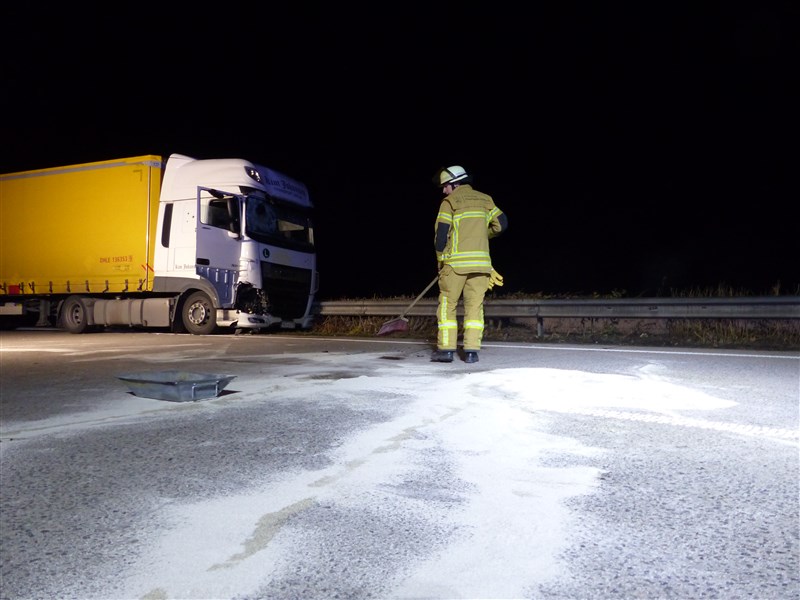 Im Baustellenbereich ereignete sich ein Verkehrsunfall. Wir wurden zum Abstreuen der ausgetretenen Betriebsstoffe alarmiert und sicherten die Unfallstelle gegen den fließenden Vekehr ab. Weiterhin wurden die Bergungsmaßnahmen unterstützt.