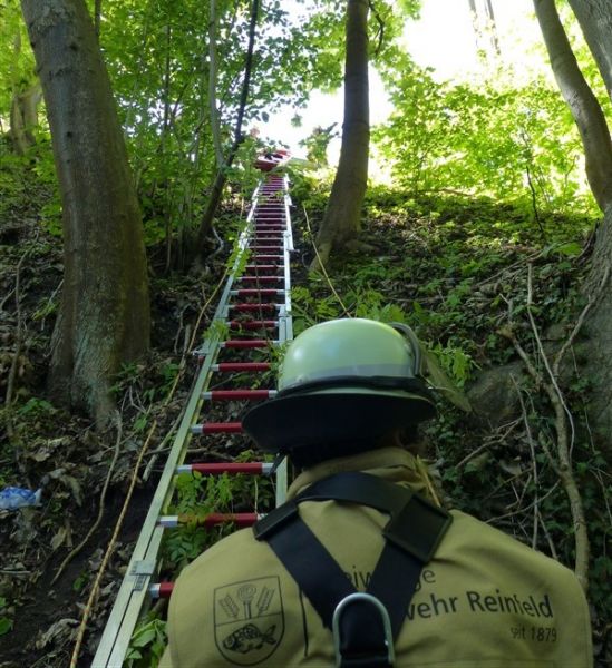 In dieser Lage musste eine verletzte Person möglichst schonend an einem steilen Hang gerettet werden. Unter Zuhilfenahme mehrerer Steckleiterteile verschaffte sich die Besatzung des Löschfahrzeugs Zugang zu der Person und führte mit unserem Rettungsrucksack die Erstversorgung durch. Der Trupp sicherte sich selbst mit dem Gerätesatz „Absturzsicherung“. Nach erfolgter Versorgung wurde die verletzte Person anschließend mit der Schleifkorbtrage den Hang hinaufgezogen. Bei dieser Variante dienen die Steckleiterteile zusätzlich als eine Art „Schienensystem“, auf welchen die Schleifkorbtrage an Leinen hinaufgezogen wird.
