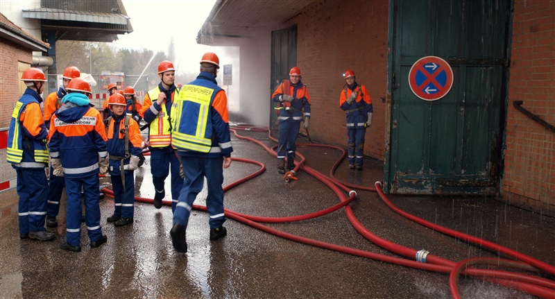 "Rauchentwicklung aus Lagerschuppen" war das Einsatzstichwort, zu dem die Jugendfeuerwehr Reinfeld und die Jugendfeuerwehr Großhansdorf am heutigen Samstag alarmiert wurden. Noch auf der Anfahrt wurde der Einsatzleiter von der Übungsleitstelle darauf aufmerksam gemacht, dass sich noch Personen im Gebäude befinden würden. Am Einsatzort angekommen, bestätigte sich die gemeldete Rauchentwicklung. Nach einer kurzen Besprechung mit den Gruppenführern kam auch schon der Befehl "Angriffstrupp zur Menschenrettung vor". Nachdem ein Trupp den Zugang in das Gebäude mithilfe eines Bolzenschneiders ermöglicht hat, konnte der Angriffstrupp in den Lagerschuppen vorgehen. Kurze Zeit später kam über Funk die Meldung, dass eine verletzte Person gefunden wurde. Diese wurde ins Freie gebracht und weiter betreut. In der Zwischenzeit wurde ein Außenangriff mit zwei C-Strahlrohren vorgenommen. Außerdem gingen zwei weitere Trupps in den Lagerschuppen vor, da noch eine weitere verletzte Person im Gebäude vermutet wurde, was sich wenig später bestätigen sollte. Auch diese Person wurde gerettet. Als darauf das Feuer gelöscht war, wurde der Rauch mithilfe des Überdruckbelüfters aus dem Gebäude "gepustet". "An alle Einheiten, Übungsende, Rückbau" war die letzte Meldung, mit dem der Einsatzleiter die Übung beendete. Letztendlich stellte sich herraus, dass drei Kinder in dem Gebäude gezündelt haben, wodurch ein Feuer ausbrach. Ein Junge konnte sich selbstständig retten und rief die Feuerwehr.