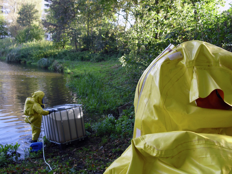 Am Samstag war der Löschzug Gefahrgut (LZ-G) des Kreises Stormarn zu Gast in der Karpfenstadt. Am und im Neuhöfer Teich wurden am Samstagmorgen mehrere Kleingebinde gesichtet, die mit verdächtigen, orangenen Warnaufklebern versehen waren. Ohne Zweifel handelte es sich um Kanister, die mit einem gefährlichen Stoff für Mensch und Umwelt befüllt waren.