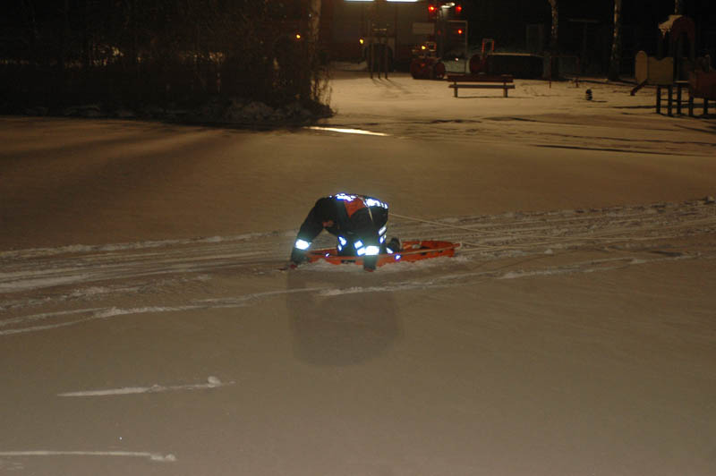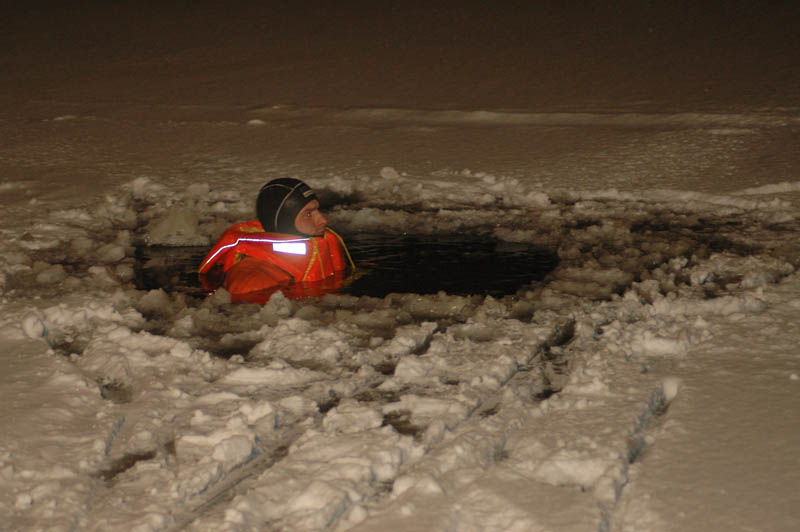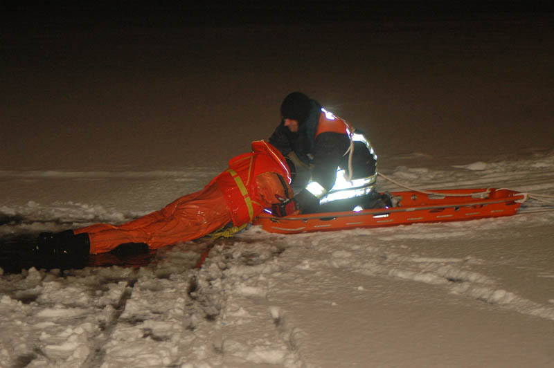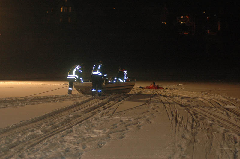 Ein Feuerwehrmann begab sich mit einem Kälteschutzanzug in ein vorher geschaffenes Loch in den Herrenteich. Nun wurden verschiedene Rettungstechniken trainiert. Das Retten der Person mit dem Aluminiumboot, mit Steckleiterteilen und der Schleifkorbtrage. Hierbei zeigten sich die Vor- und Nachteile der einzelnen Rettungsgeräte.