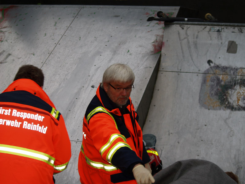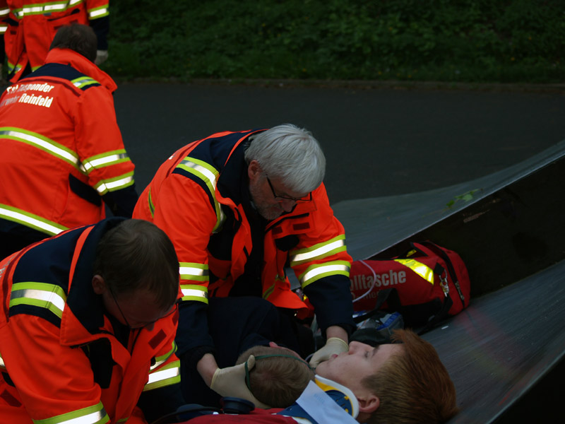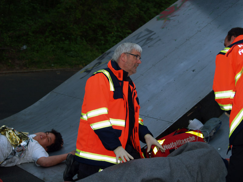 Hier erwarteten sie schon mehrere Jugendliche, die einen Unfall auf der Skateranlage beobachtet hatten. Es galt insgesamt drei verletzte Personen zu betreuen und zu behandeln.