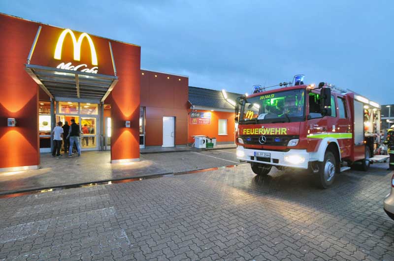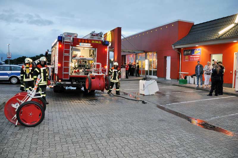 In einem Schnellrestaurant im Gewerbegebiet "An der Autobahn" brannte ein Wäschetrockner. Das Gebäude wurde vom Personal schnell und komplett geräumt. Der Angriffstrupp löschte den Wäschetrockner und brachte ihn nach draußen, wo er ausgeräumt und der Inhalt endgültig abgelöscht wurde.