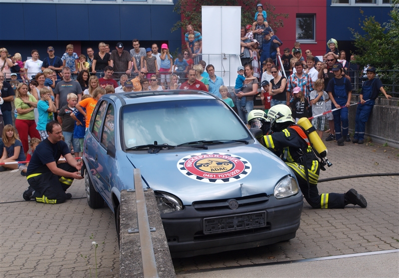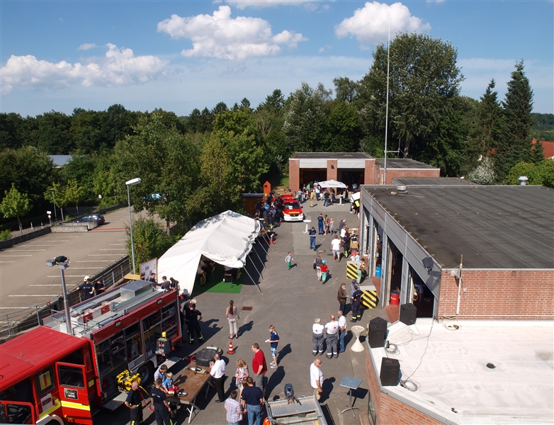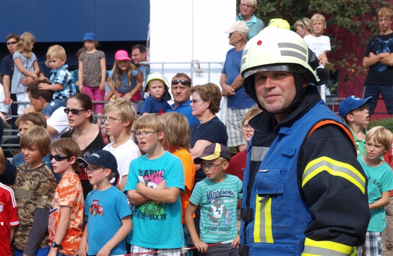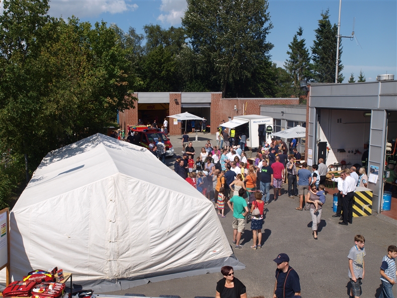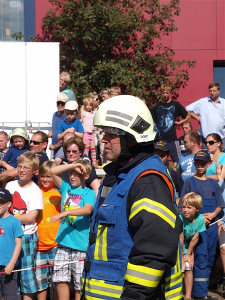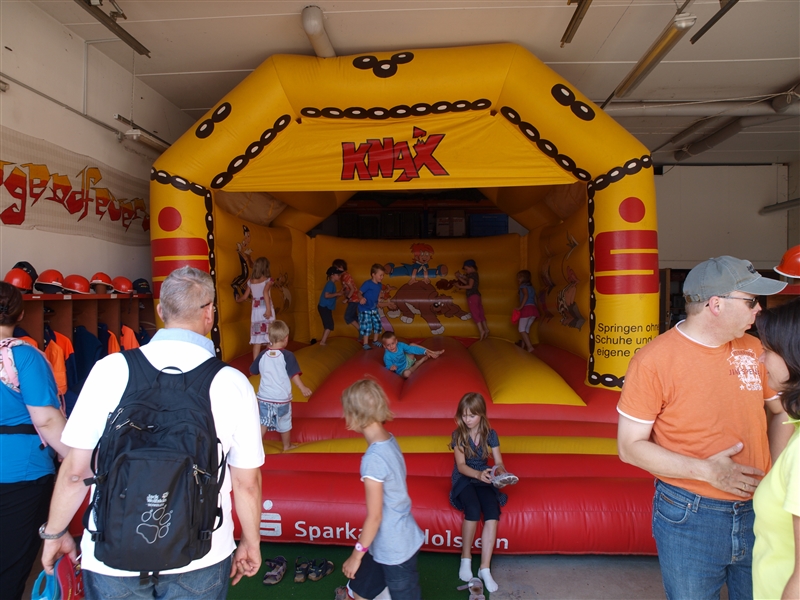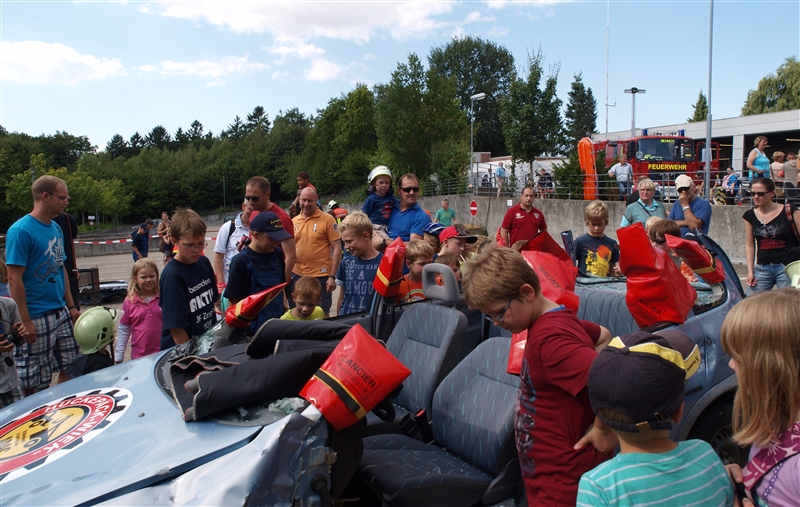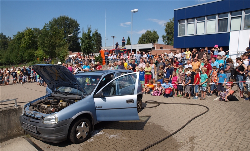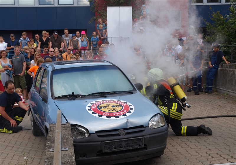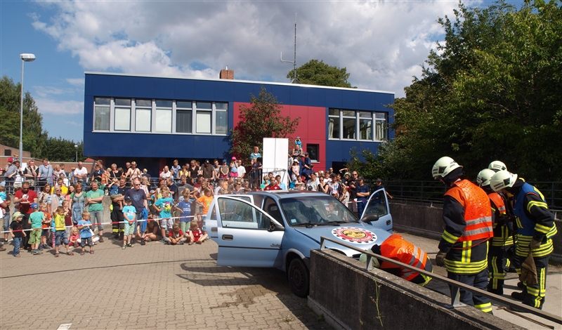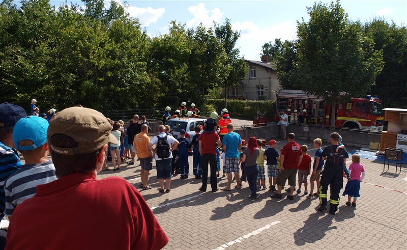 Bei verschiedenen Vorführungen, vom PKW-Brand bis zum Gefahrguteinsatz, konnten wir den Besuchern zeigen, wie die Feuerwehr arbeitet und welch moderne Technik uns dabei zur Verfügung steht. Zudem bestand im Nachhinein die Möglichkeit, näher an das Geschehen heranzutreten und Gerätschaften auch mal in die eigenen Hände zu nehmen. Für die "kleinen" Besucher boten wir ein Wasserspiel, eine Hüpfburg und Dosenwerfen an, was sehr gut angenommen wurde. Auch für das leibliche Wohl wurde gesorgt; in Form von reichlich Kuchen, Pommes und Leckereien vom Grill.