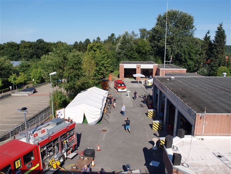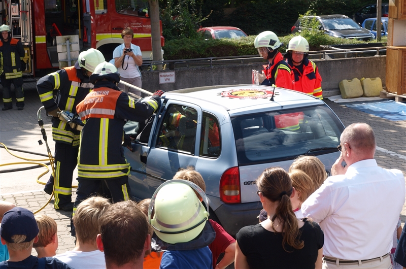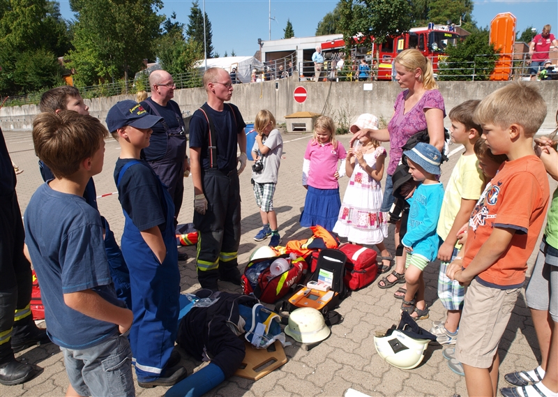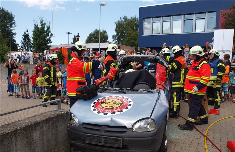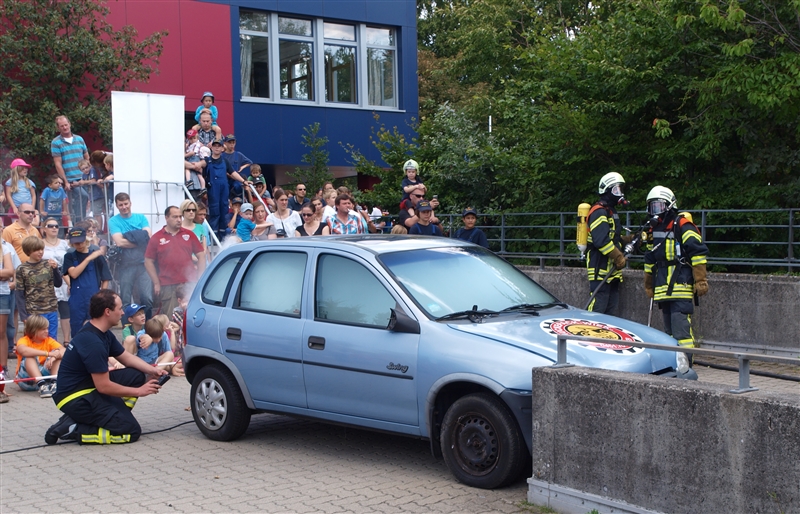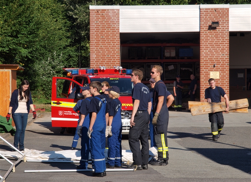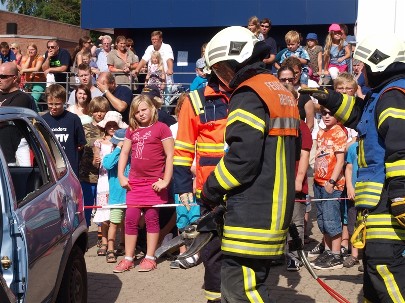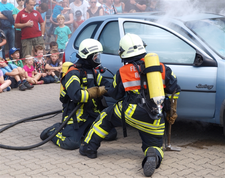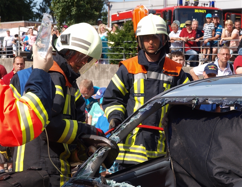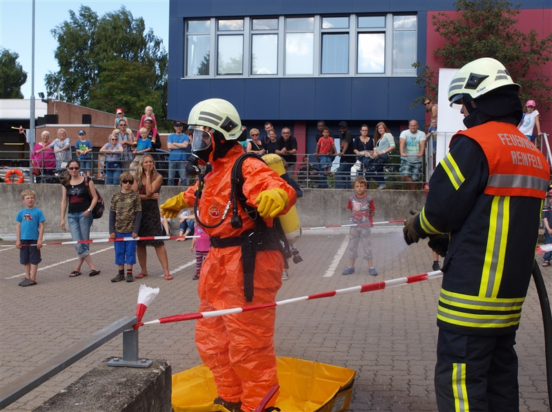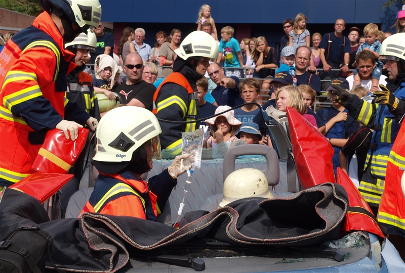 Bei verschiedenen Vorführungen, vom PKW-Brand bis zum Gefahrguteinsatz, konnten wir den Besuchern zeigen, wie die Feuerwehr arbeitet und welch moderne Technik uns dabei zur Verfügung steht. Zudem bestand im Nachhinein die Möglichkeit, näher an das Geschehen heranzutreten und Gerätschaften auch mal in die eigenen Hände zu nehmen. Für die "kleinen" Besucher boten wir ein Wasserspiel, eine Hüpfburg und Dosenwerfen an, was sehr gut angenommen wurde. Auch für das leibliche Wohl wurde gesorgt; in Form von reichlich Kuchen, Pommes und Leckereien vom Grill.