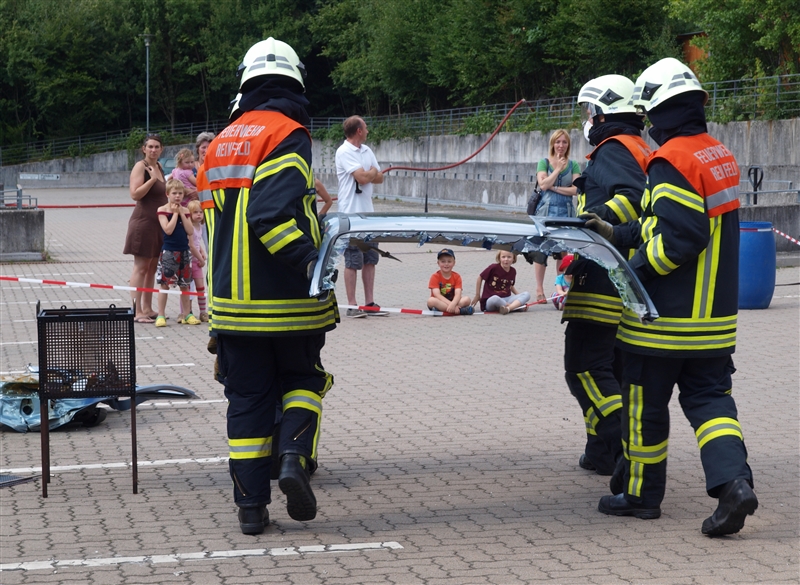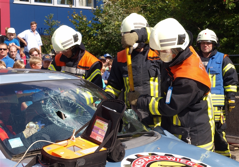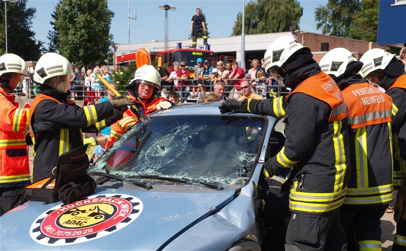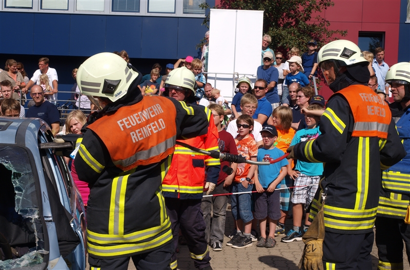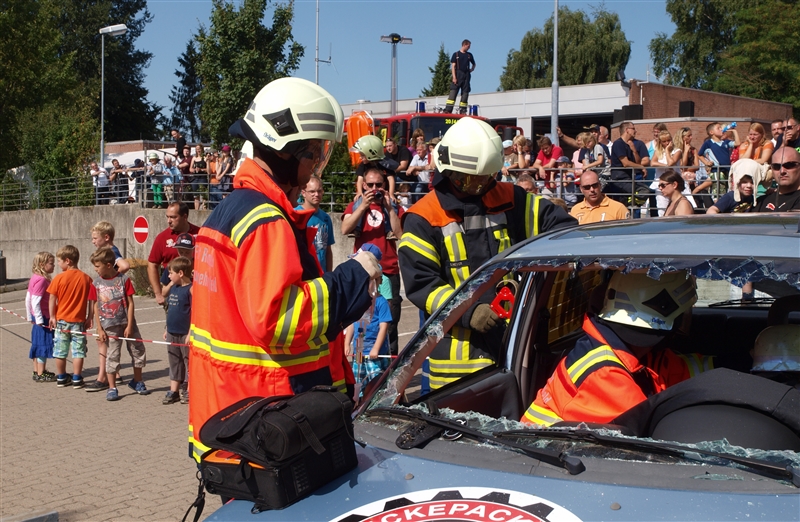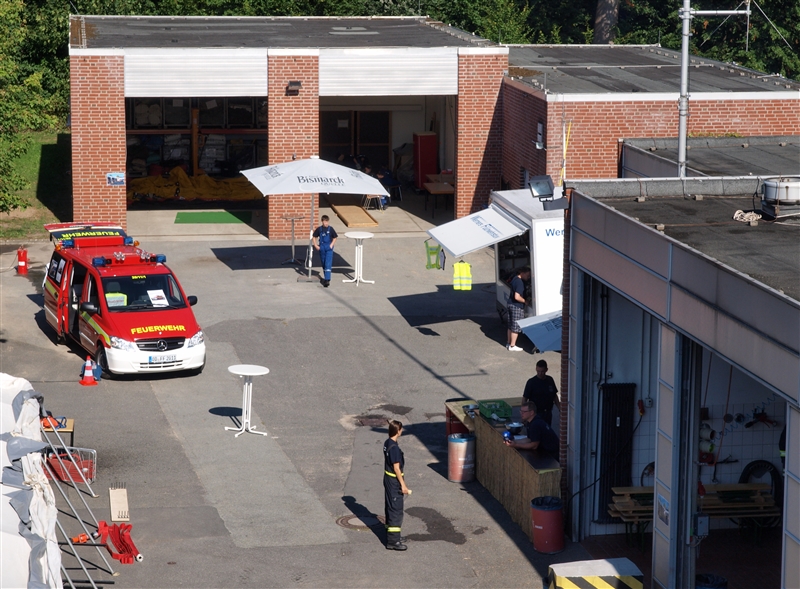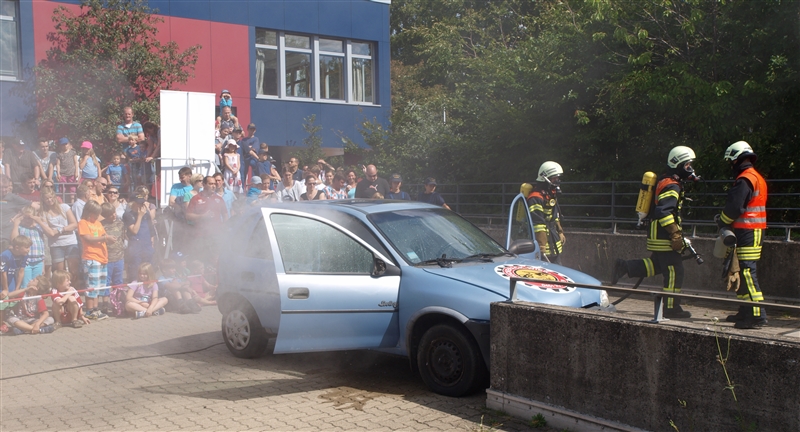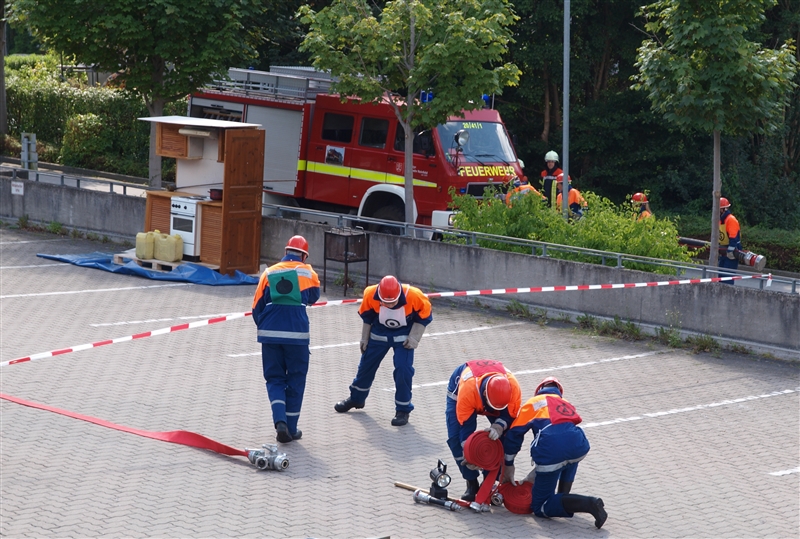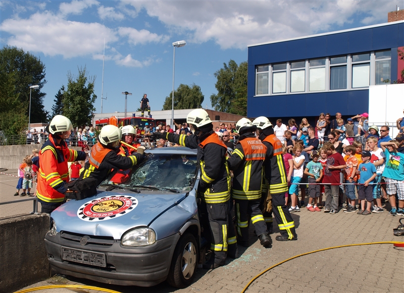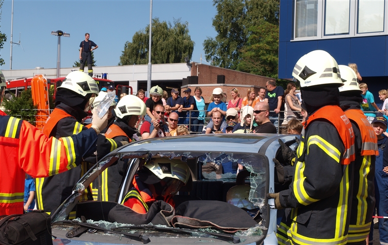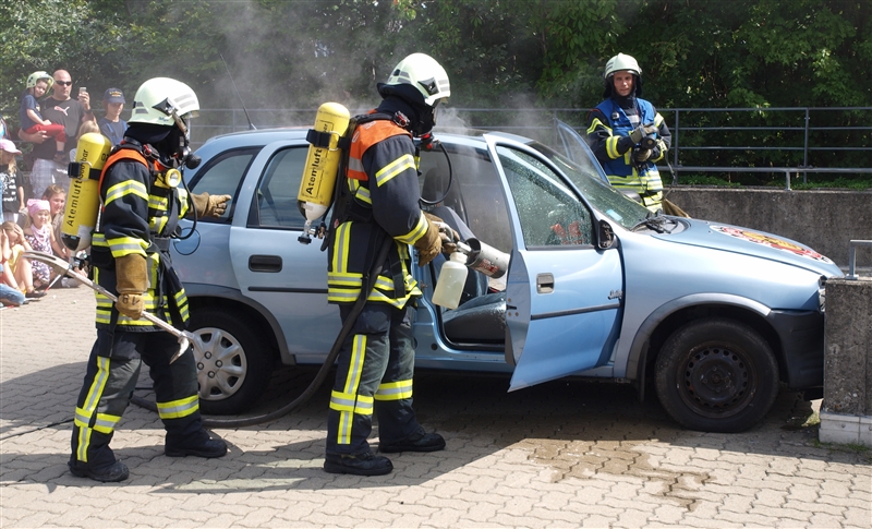 Bei verschiedenen Vorführungen, vom PKW-Brand bis zum Gefahrguteinsatz, konnten wir den Besuchern zeigen, wie die Feuerwehr arbeitet und welch moderne Technik uns dabei zur Verfügung steht. Zudem bestand im Nachhinein die Möglichkeit, näher an das Geschehen heranzutreten und Gerätschaften auch mal in die eigenen Hände zu nehmen. Für die "kleinen" Besucher boten wir ein Wasserspiel, eine Hüpfburg und Dosenwerfen an, was sehr gut angenommen wurde. Auch für das leibliche Wohl wurde gesorgt; in Form von reichlich Kuchen, Pommes und Leckereien vom Grill.