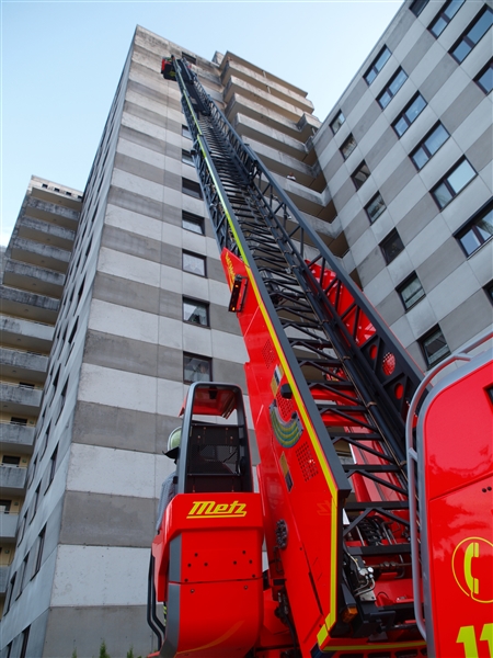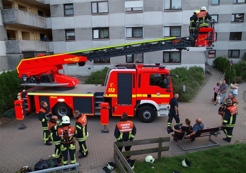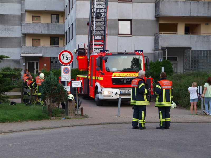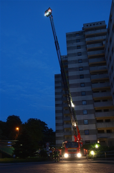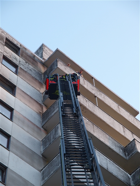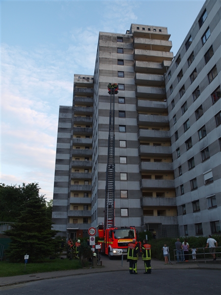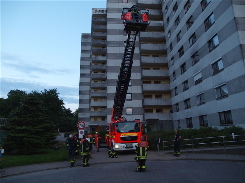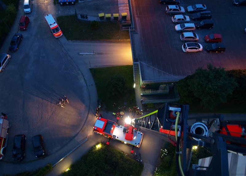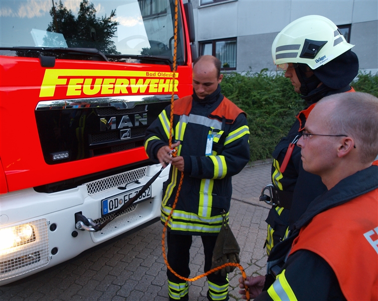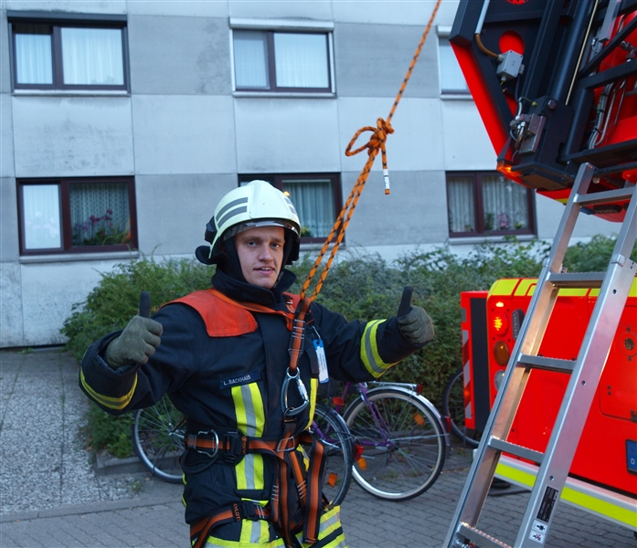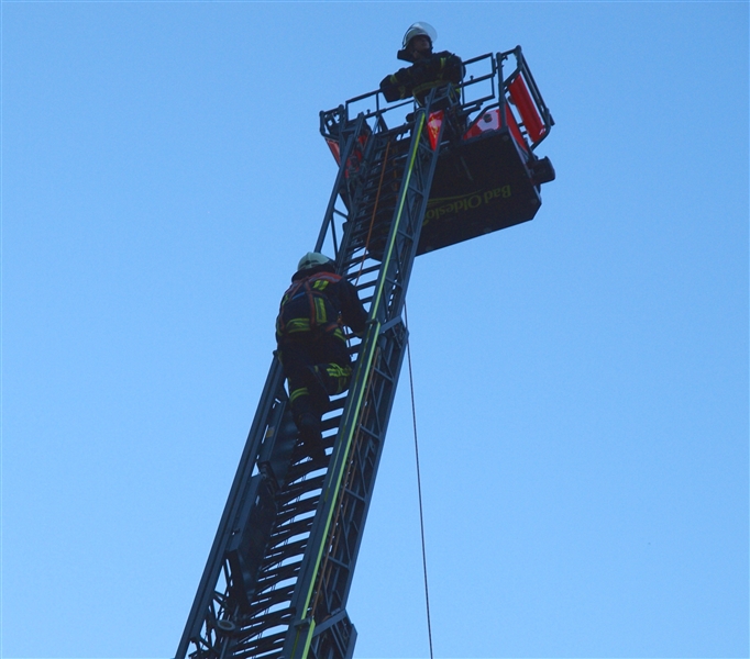 Zusammen mit einigen Kameraden der Feuerwehr Bad Oldesloe und deren Drehleiter übte die erste Gruppe am Hochhaus in Reinfeld. Jeder durfte einmal ausprobieren, wie es sich anfühlt, 30 Meter über dem Boden in einem Korb zu stehen, der auch noch anfängt zu schwanken, wenn man sich darin bewegt. Wer sich traute, durfte im Anschluss einmal selbst versuchen, aus eigener Kraft die Leiter zu erklimmen. Eine wirklich interessante und aufregende Erfahrung!