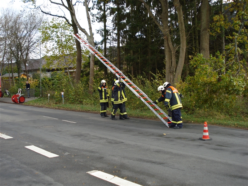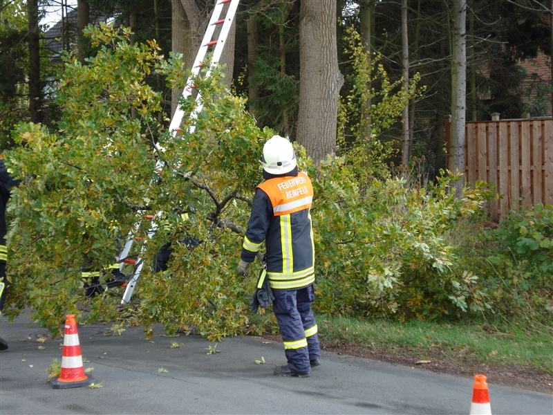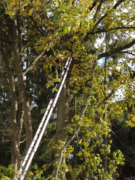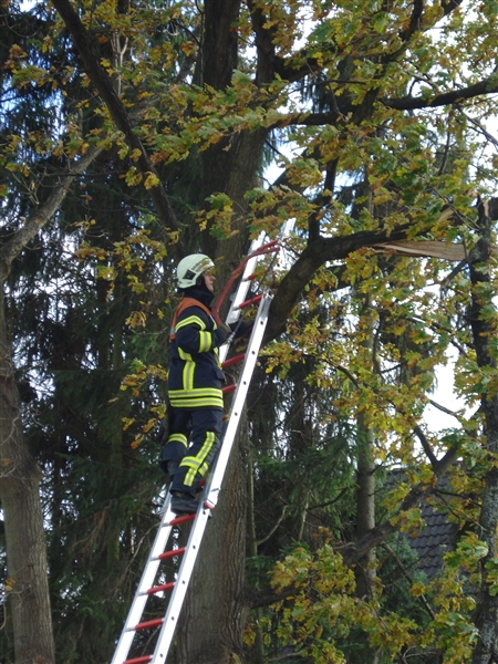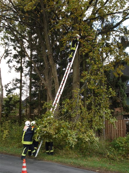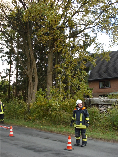 | Ein größerer Ast drohte auf die Straße zu stürzen. Der Ast wurde mit der Bügelsäge beseitigt. |