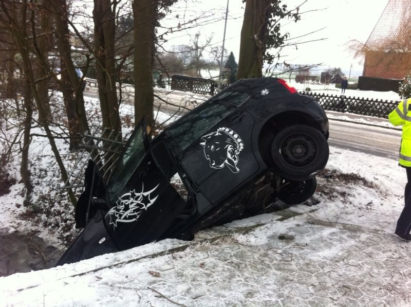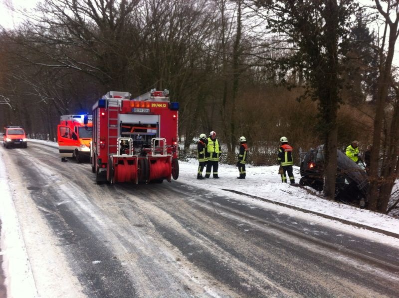 | Die Freiwillige Feuerwehr Reinfeld wurde zu einem Verkehrsunfall mit eingeklemmter Person in die Straße Bolande alarmiert. Dort war ein PKW von der Straße abgekommen, gegen mehrere Bäume und einen massiven Zaun geprallt und in den Graben gerutscht. Die beiden Insassen waren bereits von Ersthelfern aus dem Fahrzeug befreit worden. Die Bergung des Fahrzeugs wurde durch die FF Reinfeld unterstützt, danach wurde die Einsatzstelle an die Polizei übergeben. |