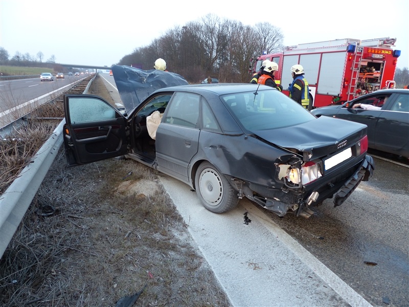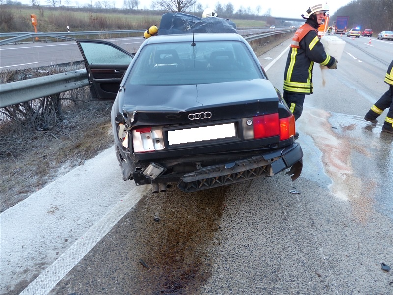 | Die Feuerwehr Reinfeld wurde mit dem Stichwort "Verkehrsunfall mit eingeklemmter Person" alarmiert. Ein PKW war gegen einen LKW und dann gegen die Mittelschutzplanke gefahren. Die beiden Insassen konnten das Fahrzeug selbst verlassen, der Wagen begann jedoch zu brennen. Das Feuer wurde gelöscht und ausgelaufene Betriebsstoffe wurden abgestreut. |