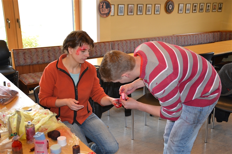 Nach bestandener theoretischer Prüfung ging es dann am letzten Tag anschaulich zur Sache. Das „RUND“-Team der DLRG (Realistische Unfall Darstellung) stellte mit Einfallsreichtum, Theaterblut und großem Engagement typische Szenen aus dem Einsatzalltag eines DLRG-Sanitäters oder First Responders der Feuerwehr dar, die von den Anwärtern unter kritischen Augen von jeweils 2 Prüfern abgearbeitet werden mussten.