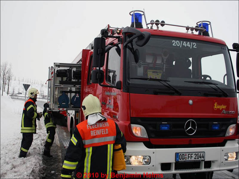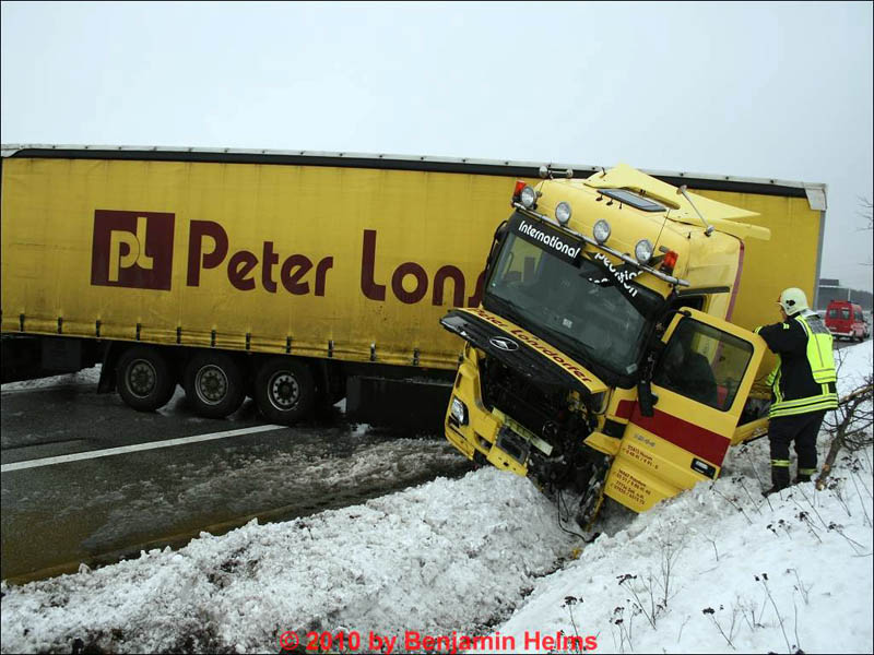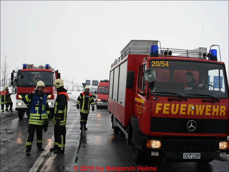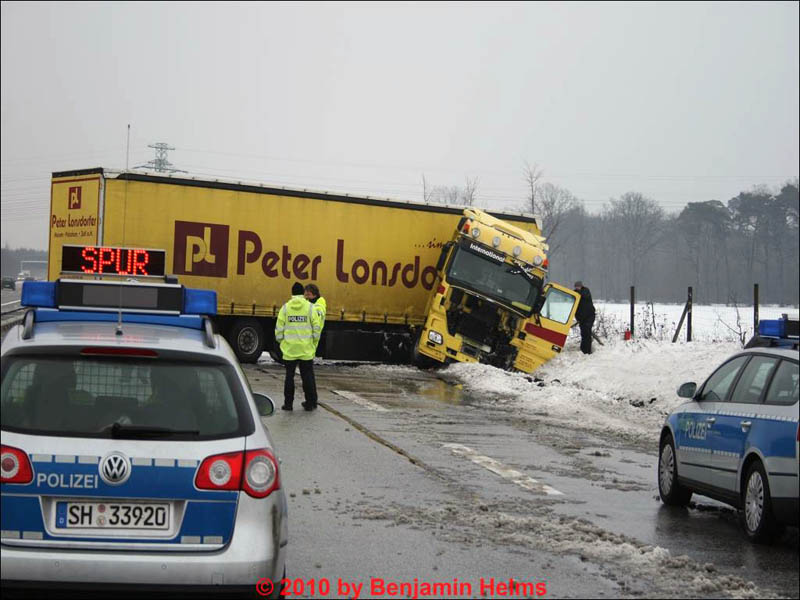 Ein LKW-Fahrer verlor im Kreuz Lübeck aus bislang ungeklärter Ursache die Kontrolle über seinen Sattelzug. Die Zugmaschine drehte und verkeilte sich mit dem Auflieger. Die Feuerwehr Reinfeld rückte aus, um den in größeren Mengen auslaufenden Dieselkraftstoff aufzunehmen. Dabei dichtete sie das Leck am Tank ab und füllte den noch verbliebenen Diesel mittels Fasspumpe aus dem Tank in bereitstehende Auffangbehälter um. Während des Einsatzes wurden mehr als drei dutzend Säcke Ölbindemittel verbraucht. |