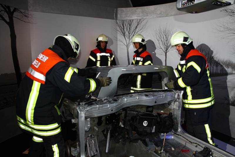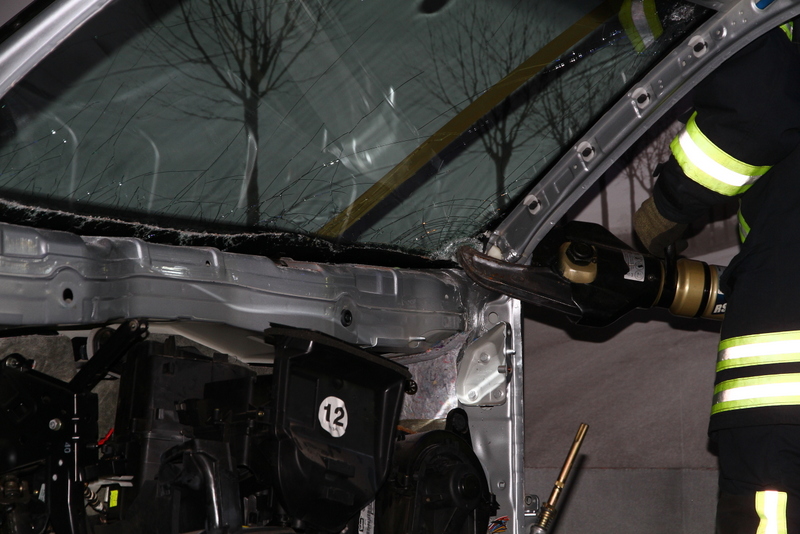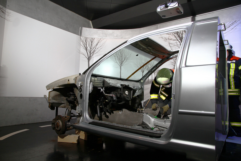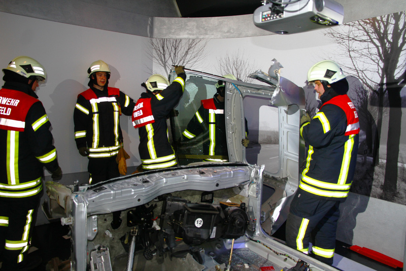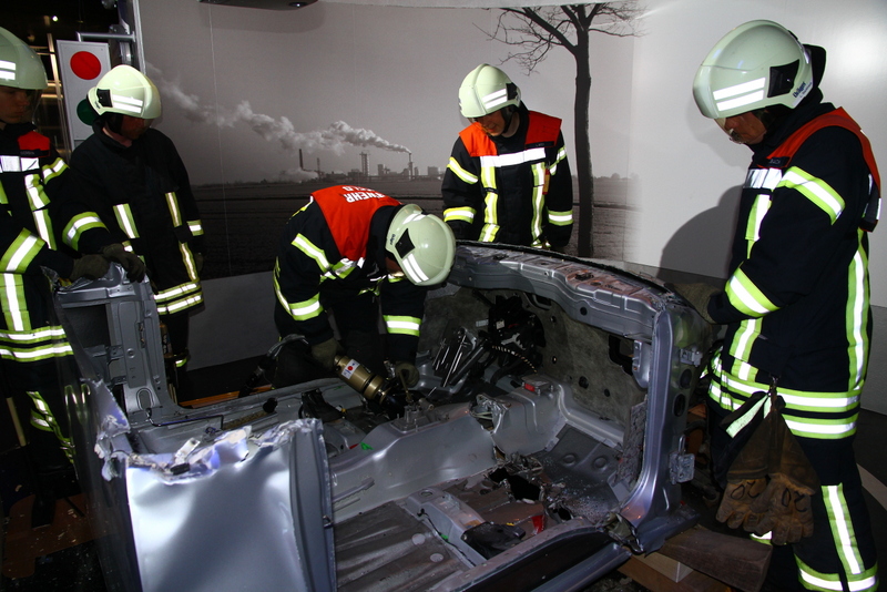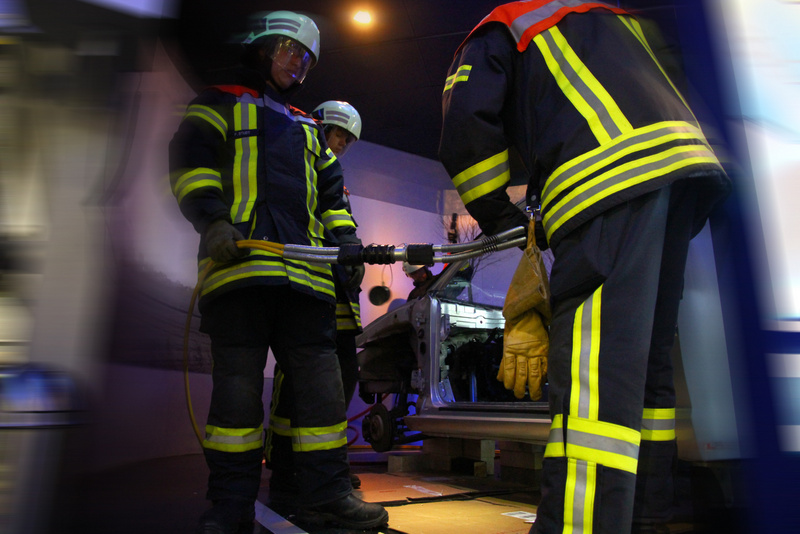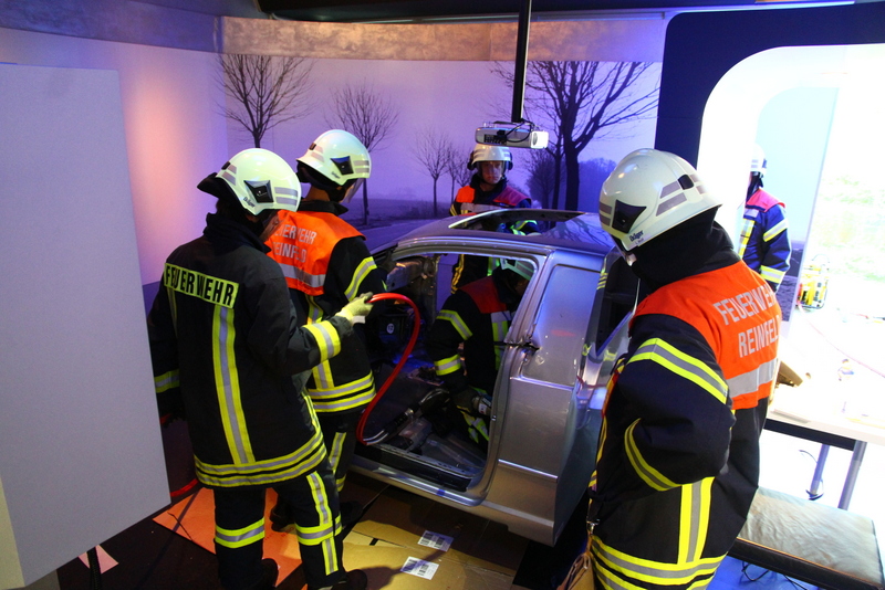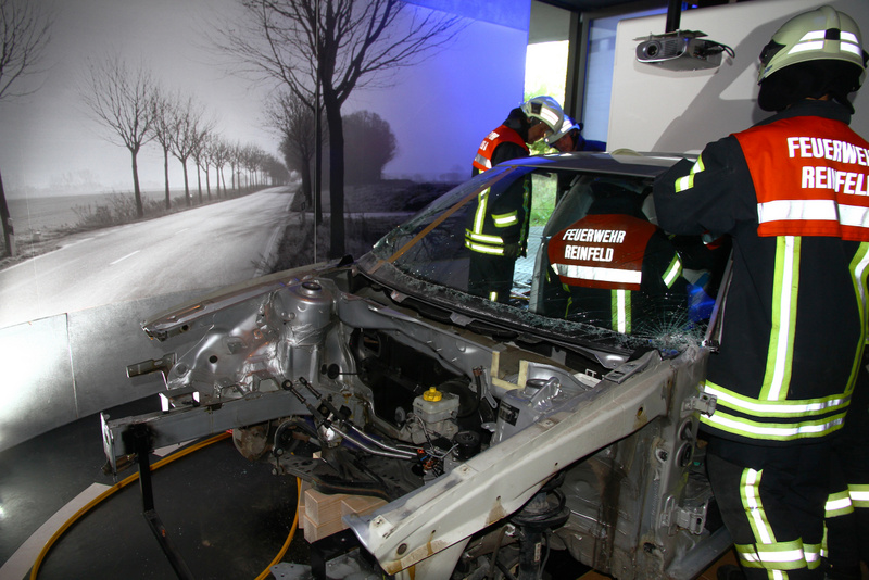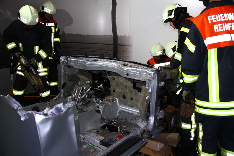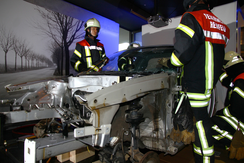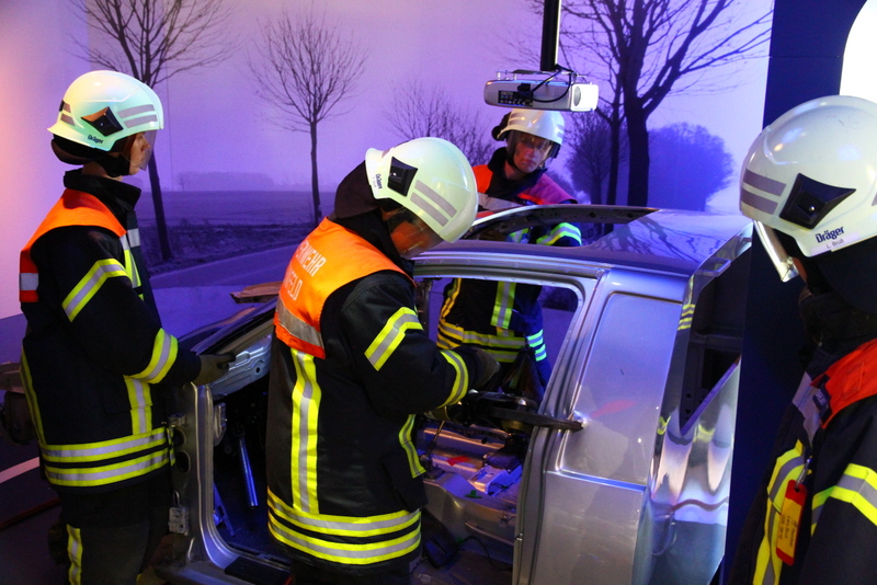 Da einer unserer Kameraden seine Ausbildung bei der Firma Dräger in Lübeck macht, trat ein Mitarbeiter an ihn heran und bat um Hilfe. Es ging darum, einen Fahrsimulator aus der Unternehmensausstellung zu entfernen, weil man sich für ein neueres Modell entschieden hatte. Da die Ausstellung quasi um den Simulator herumgebaut wurde und Türen und Fenster nicht groß genug waren, musste der halbe PKW erst mittels hydraulischem Gerät in kleine Teile zerlegt und dann durch eine Notausgangstür nach draußen befördert werden. Wir nutzten die Gelegenheit um den Umgang mit dem hydraulischen Rettungsgerät zu üben.