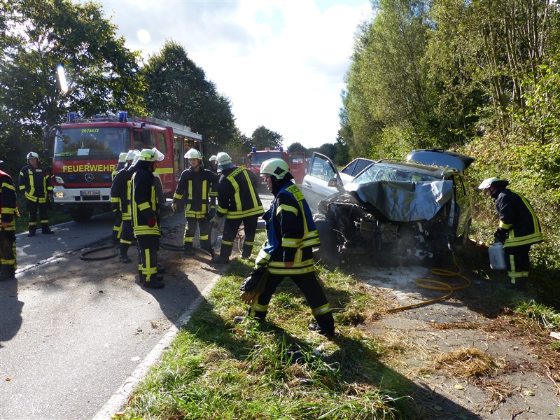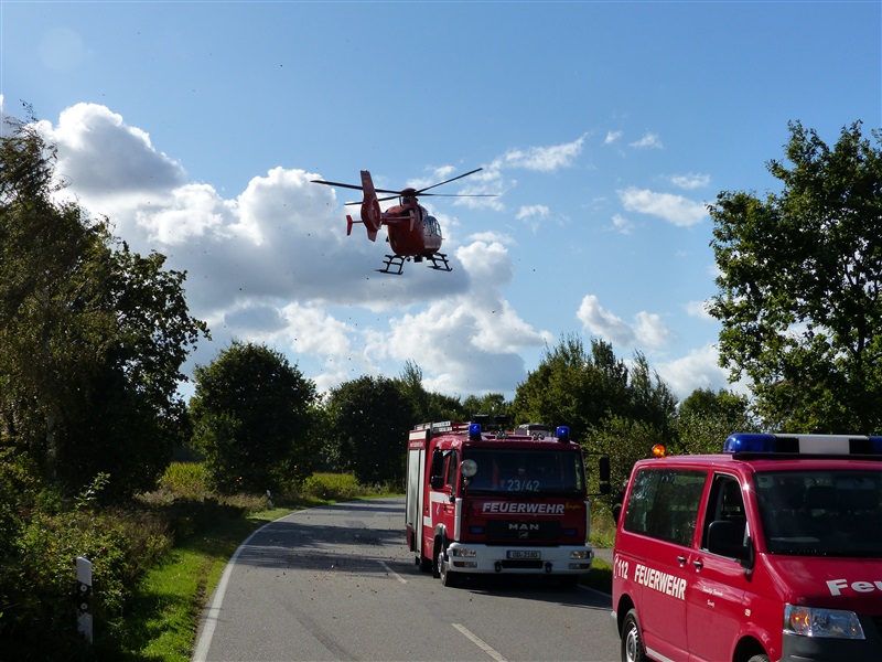 | Der Fahrer eines PKW kam mit seinem Fahrzeug nach links von der Fahrbahn ab und wurde eingeklemmt. Die FF Reinfeld unterstützte die FF Barnitz bei der patientengerechten Rettung des Fahrers. |