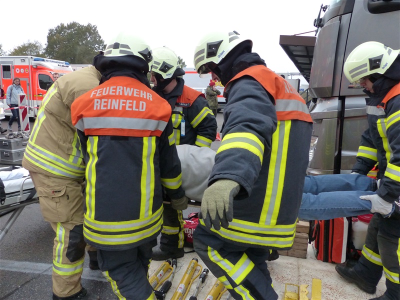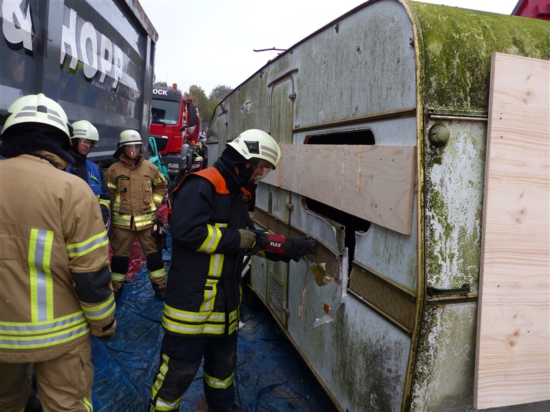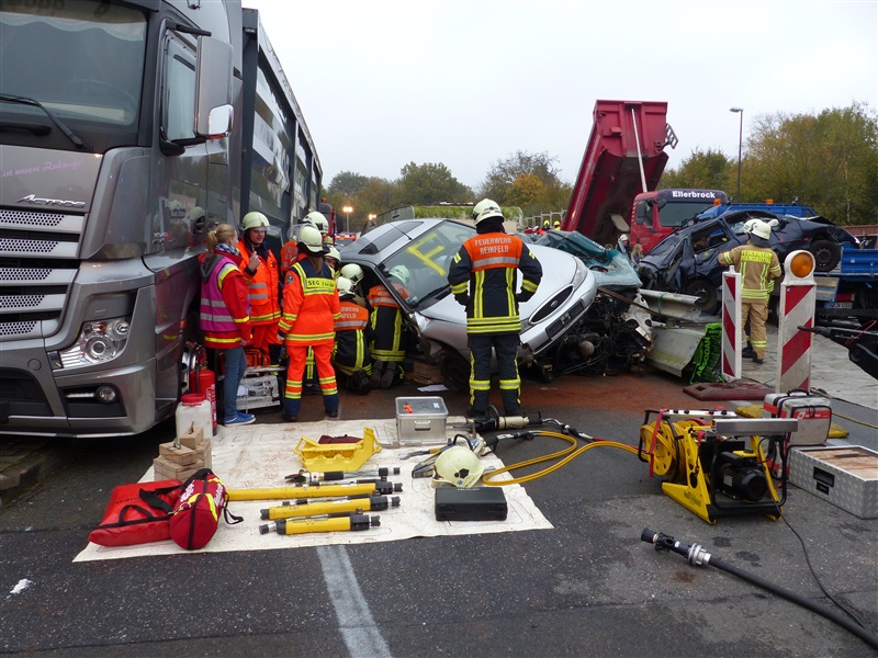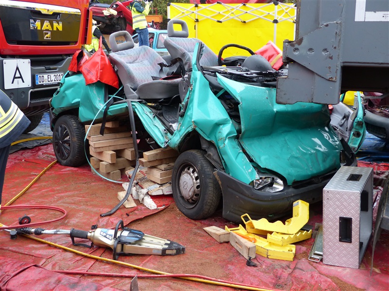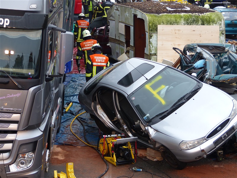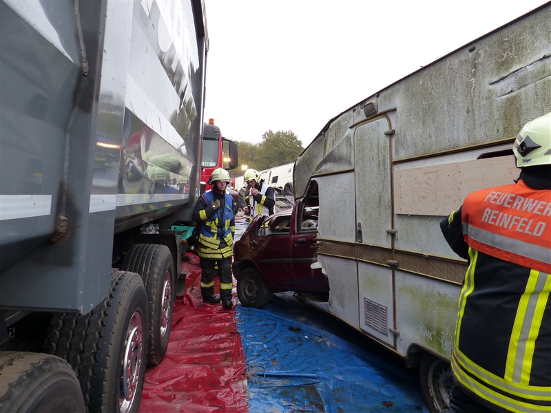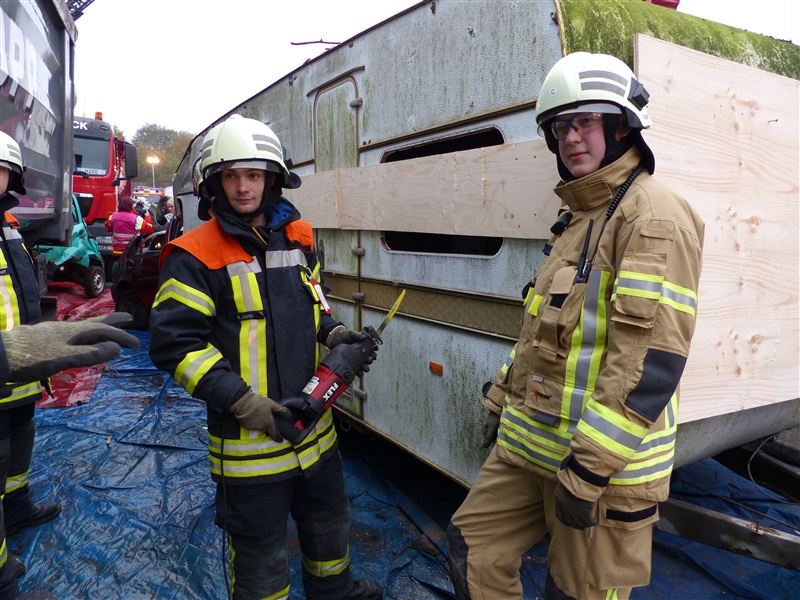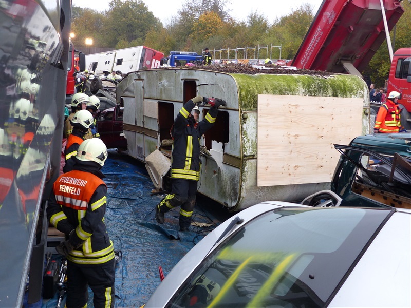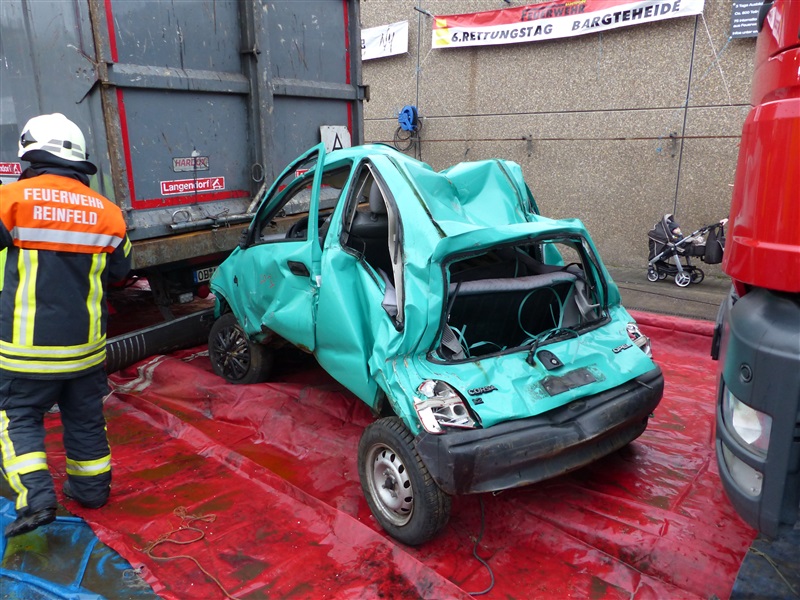 Bereits zum zweiten Mal nahmen wir mit einer Gruppe an den Bargteheider Rettungstagen teil. Wie zuletzt vor zwei Jahren wurde auch dieses Mal eine Großschadenslage simuliert, bei der mehrere PKW, Baumaschinen und ein Linienbus verunglückt sind. Die Feuerwehr Reinfeld wurde im Abschnitt 1 eingesetzt. Hier wurde unter anderem ein PKW zwischen zwei LKW eingeklemmt. Zudem ist ein PKW in einen Wohnwagen gerast, in dem sich noch Personen befanden. Ziel dieser Übung war es nicht, die Verletzen schnellstmöglich aus ihrer misslichen Lage zu befreien. Vielmehr ging es darum, dass jeder einmal mit den diversen Gerätschaften arbeiten konnte, um so im Ernstfall richtig handeln zu können.