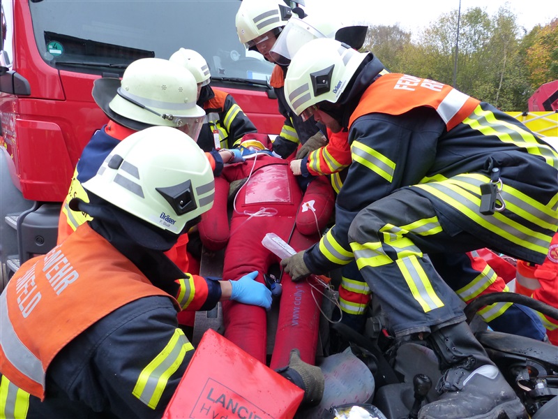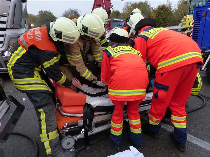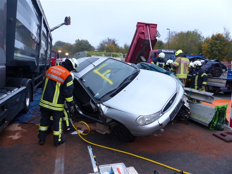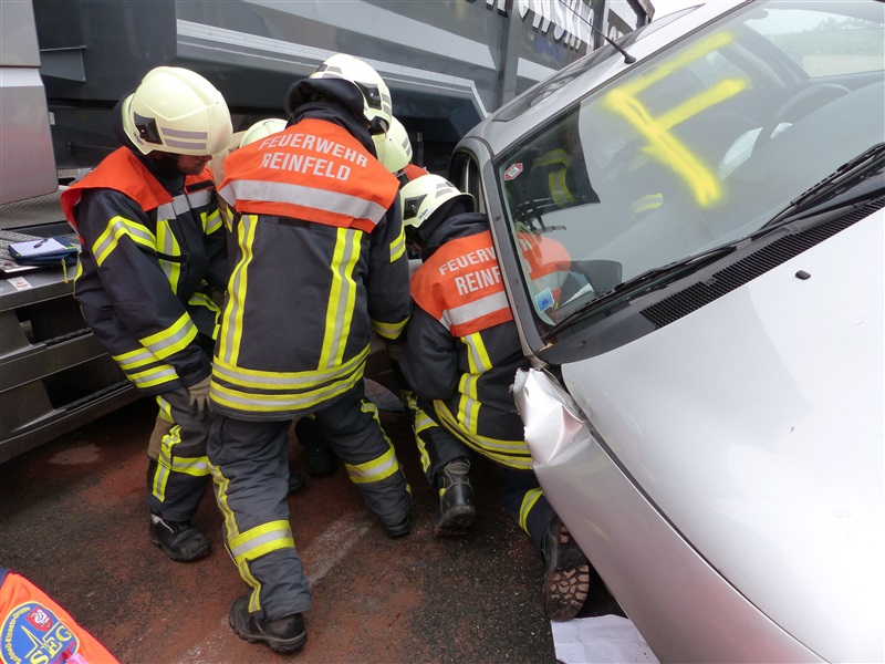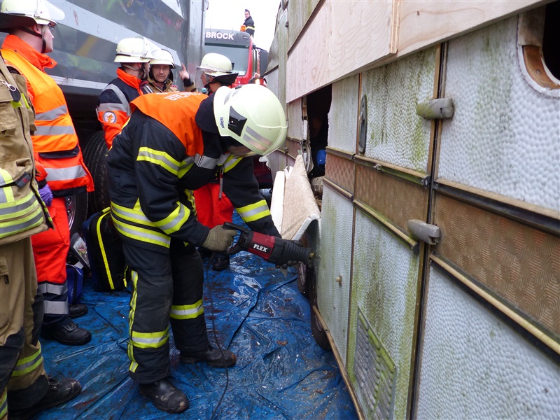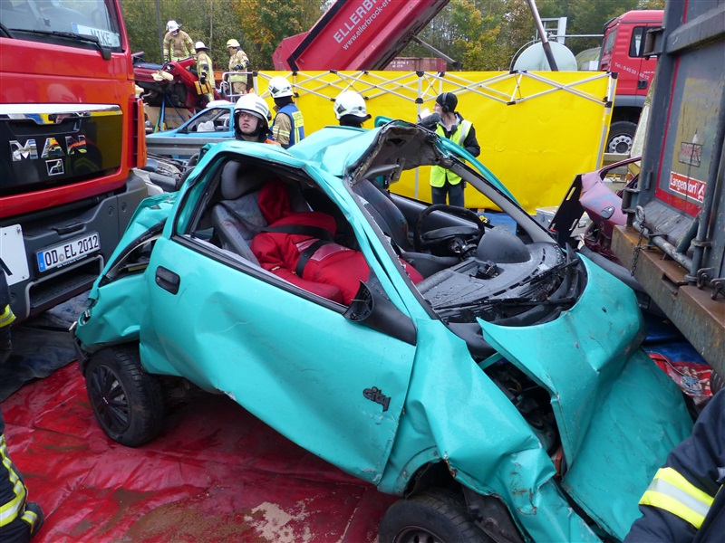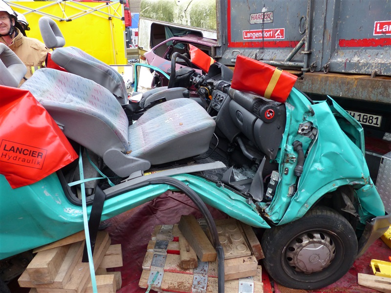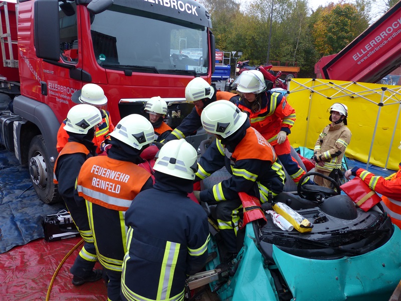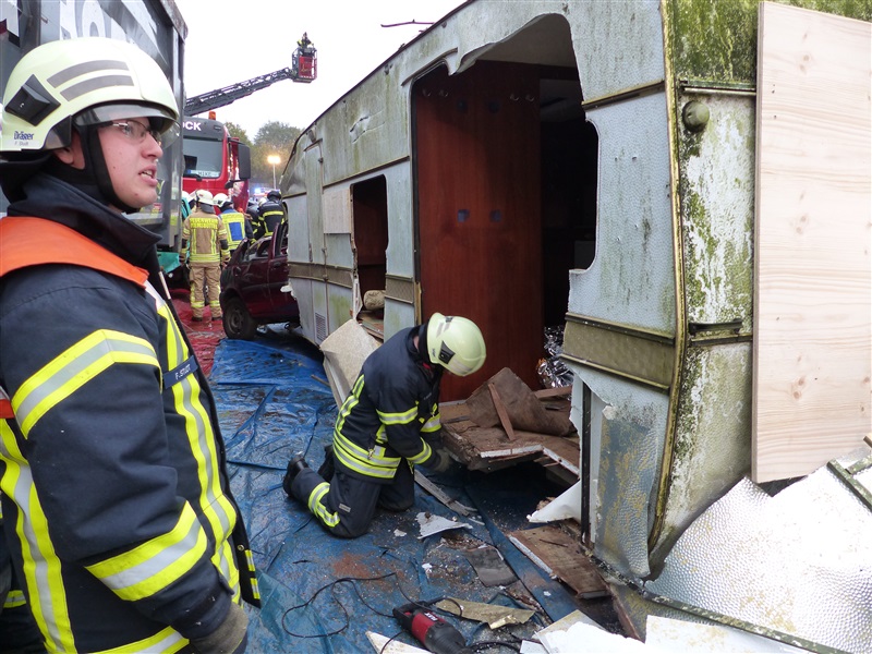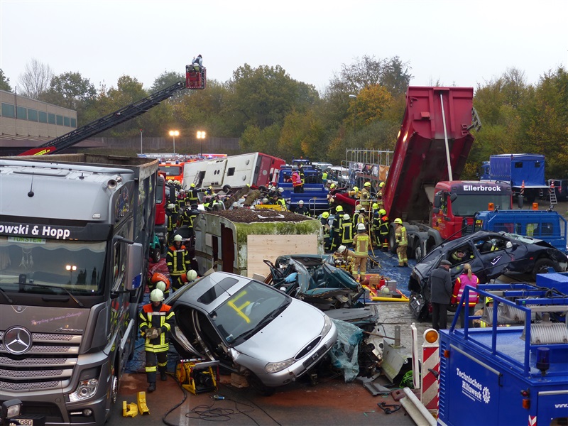 Bereits zum zweiten Mal nahmen wir mit einer Gruppe an den Bargteheider Rettungstagen teil. Wie zuletzt vor zwei Jahren wurde auch dieses Mal eine Großschadenslage simuliert, bei der mehrere PKW, Baumaschinen und ein Linienbus verunglückt sind. Die Feuerwehr Reinfeld wurde im Abschnitt 1 eingesetzt. Hier wurde unter anderem ein PKW zwischen zwei LKW eingeklemmt. Zudem ist ein PKW in einen Wohnwagen gerast, in dem sich noch Personen befanden. Ziel dieser Übung war es nicht, die Verletzen schnellstmöglich aus ihrer misslichen Lage zu befreien. Vielmehr ging es darum, dass jeder einmal mit den diversen Gerätschaften arbeiten konnte, um so im Ernstfall richtig handeln zu können.
