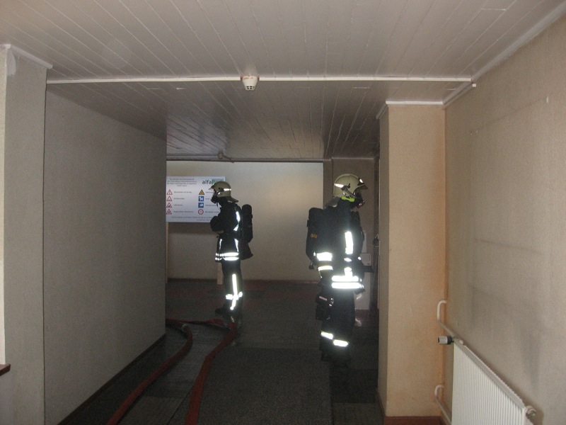 Schnell wurden die Fahrzeuge besetzt und es wurde zum Einsatzort ausgerückt. Hier schrillte dann tatsächlich die Brandmeldeanlage, sie zeigte ein Feuer im Bürotrakt an.