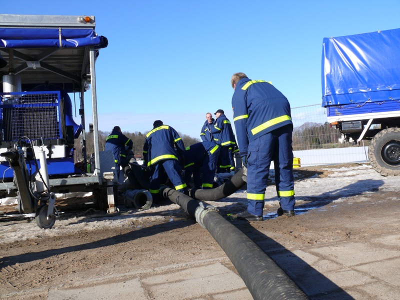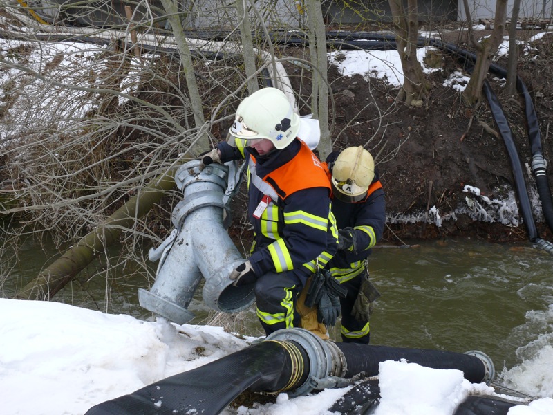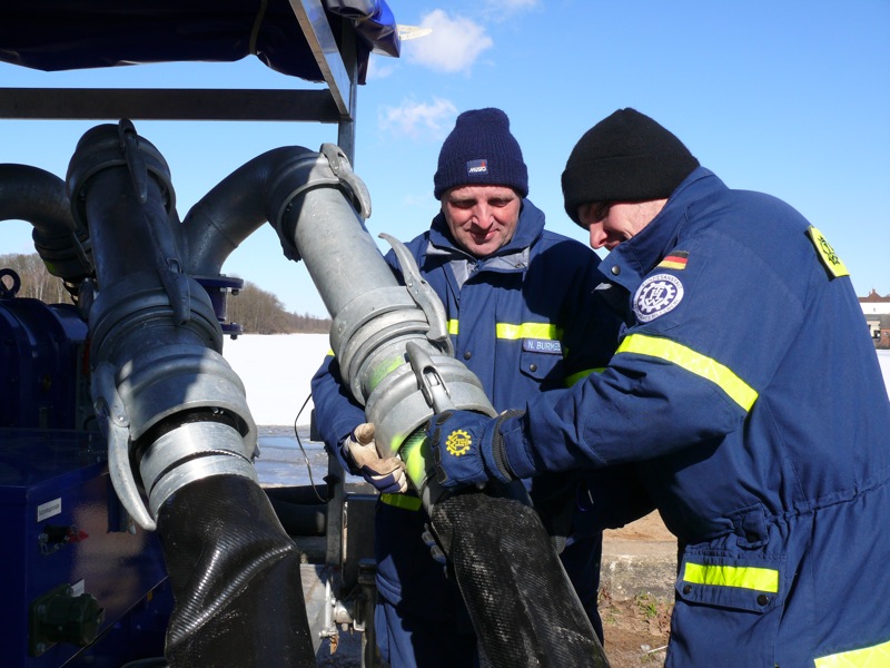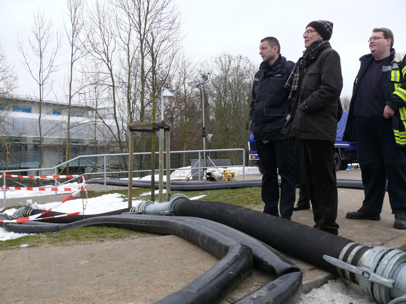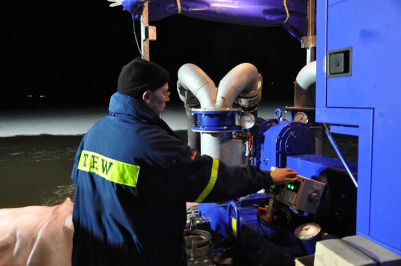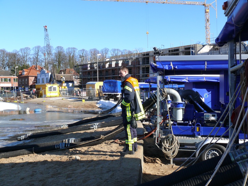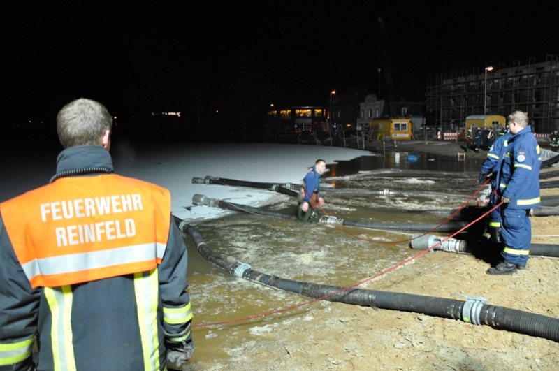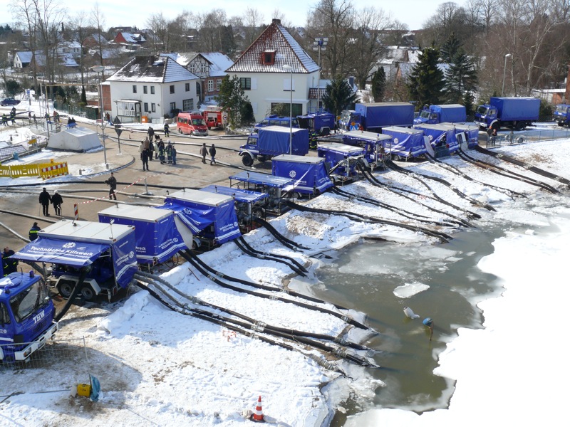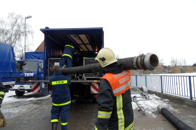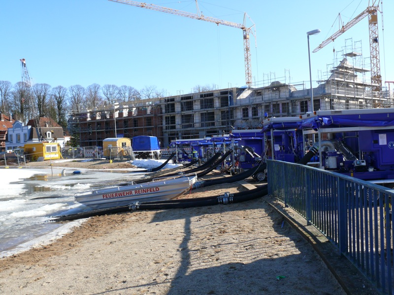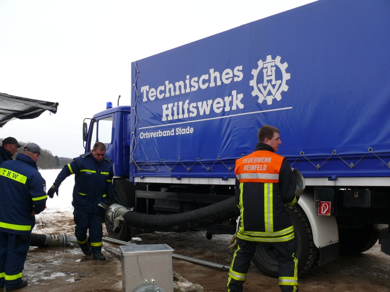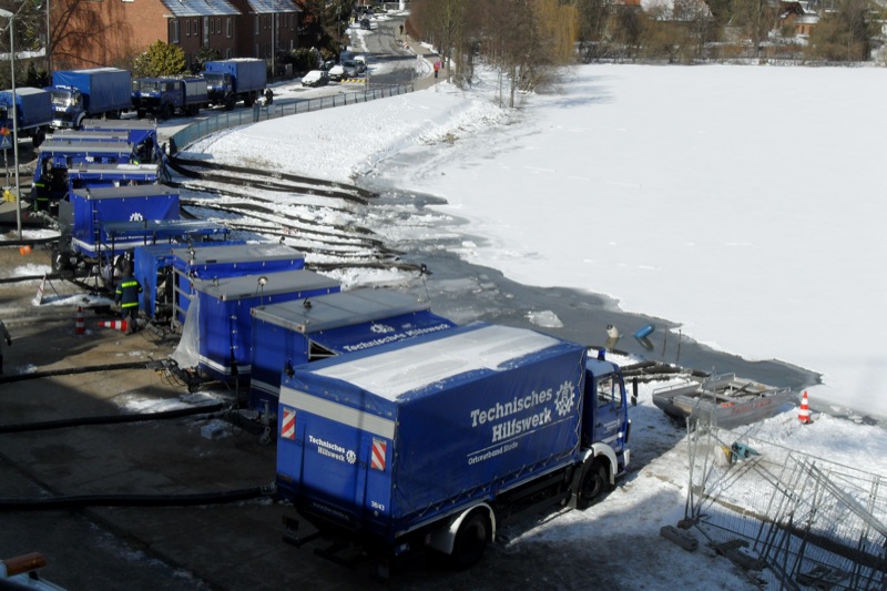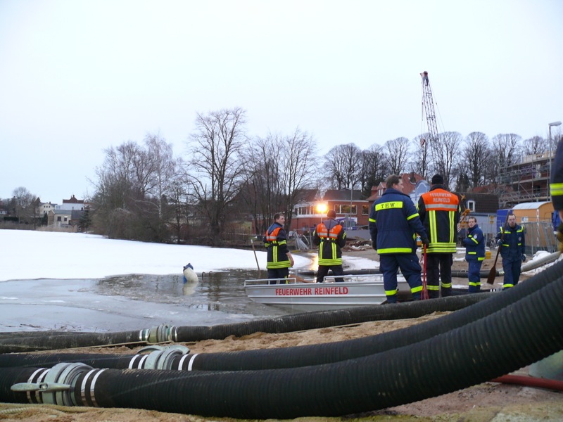 Mittwoch, 03.02.2010 Am Mittwochmorgen rief die Stadtverwaltung erneut beim Wehrführer an und teilte mit, dass das Wasser weiter gestiegen sei und jetzt auch an einer anderen Stelle des Teiches überzulaufen drohte – mit nicht unerheblichen Folgen für die dortige Baustelle und weitere angrenzende Objekte. Der Wehrführer zog den Ortsbeauftragten des THW Bad Oldesloe, Olaf Göttsche, mit hinzu. Dieser brachte einen Experten in Sachen "Wasserschaden/Pumpen", den Zugführer des THW Mölln, mit an die Einsatzstelle. Aufgrund seiner großen Erfahrung mit solchen Ereignissen berechnete er, dass es eine Möglichkeit zur Entlastung des Wehres gebe: Man müsste behutsam anfangen zu pumpen, um das Wasser nach und nach hinter dem Wehr wieder einleiten zu können. Der Bürgermeister entschied daraufhin, das THW und die Feuerwehr in den Einsatz zu bringen. In erster Alarmierung wurden große Pumpen aus Mölln, Bad Segeberg, Hamburg-Bergedorf, Oldenburg i.H., Wismar und Elmshorn eingesetzt, so wurde eine Pumpenleistung von bis zu 40.000 Litern pro Minute erreicht. Beim Aufbau der Pumpen unterstützten die Kräfte der Feuerwehr, unter anderem beim Öffnen der noch ca. 20cm dicken Eisschicht auf dem Herrenteich. Das THW Ahrensburg war mit der Fachgruppe "Beleuchtung" ebenfalls mit im Einsatz und sorgte für eine taghelle Szenerie am Herrenteich. Zusammen mit dem THW wurde auch das DRK Reinfeld alarmiert, um heiße Getränke und eine warme Suppe zu liefern. Die Bereiche an der Mühlenau, am Kalkgraben und der Trave wurden regelmäßig kontrolliert, um schnell reagieren zu können, sollten die zusätzlichen Wassermengen nicht aufgenommen werden können.