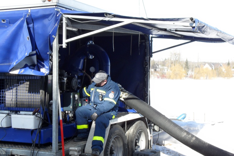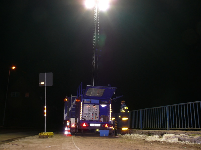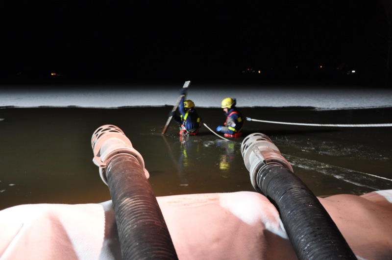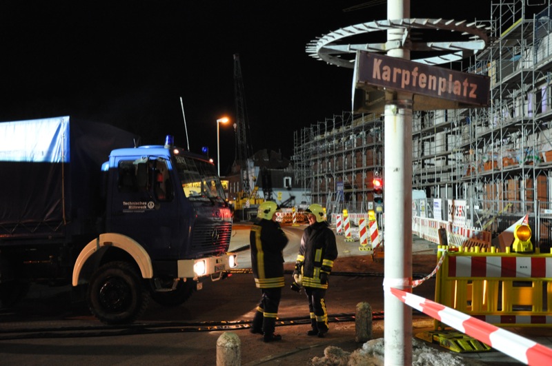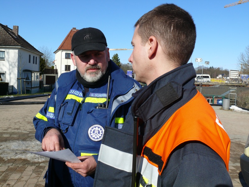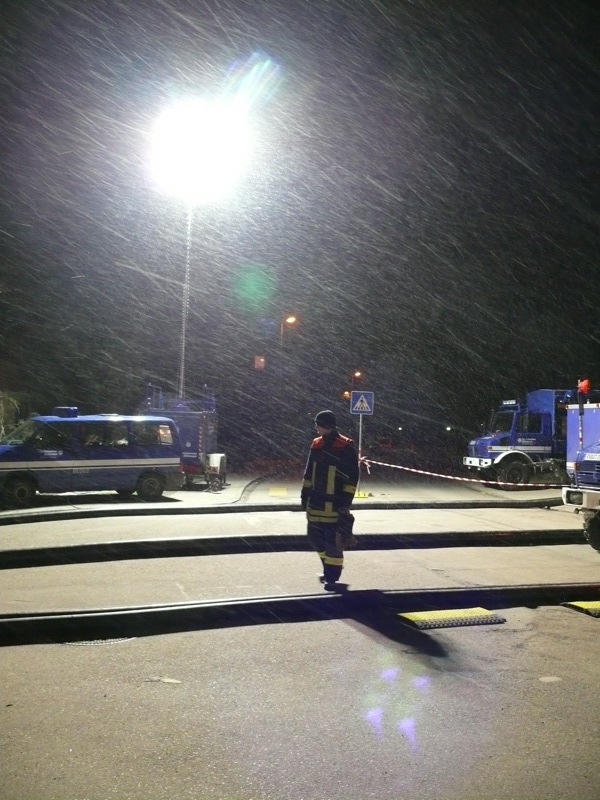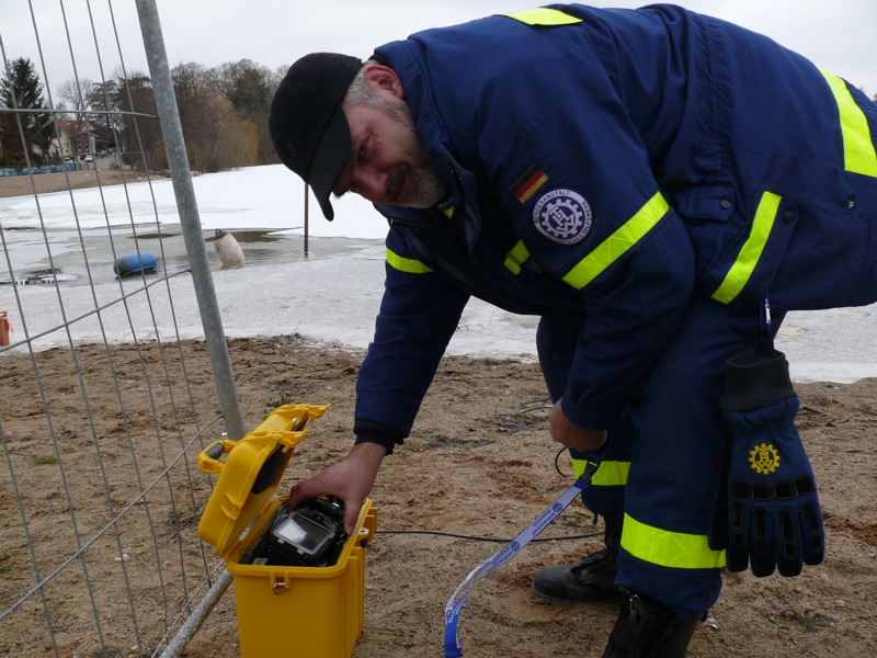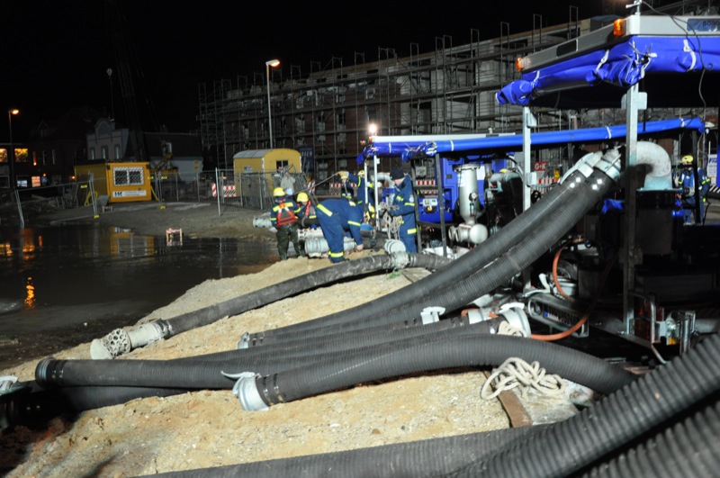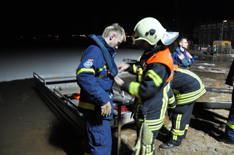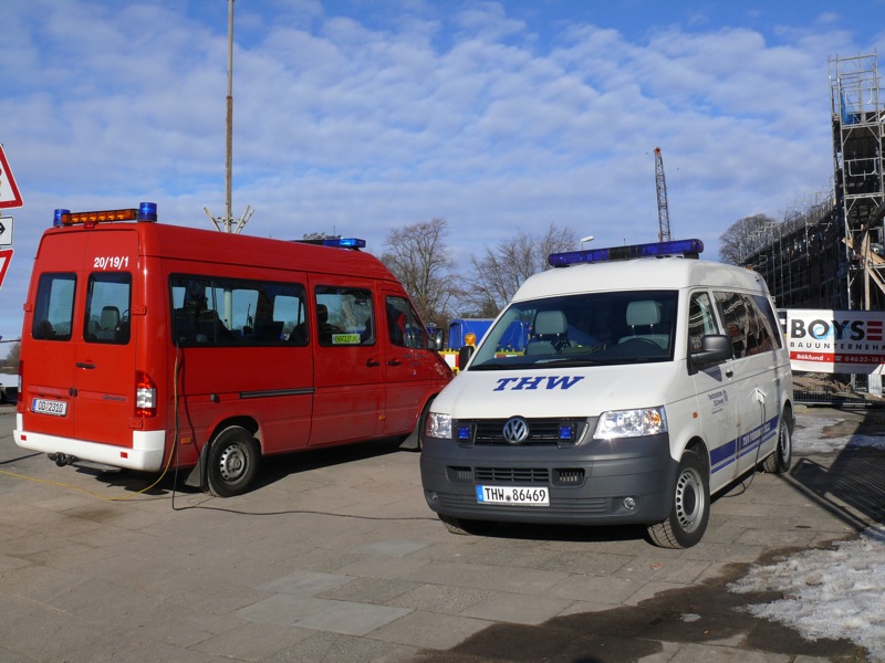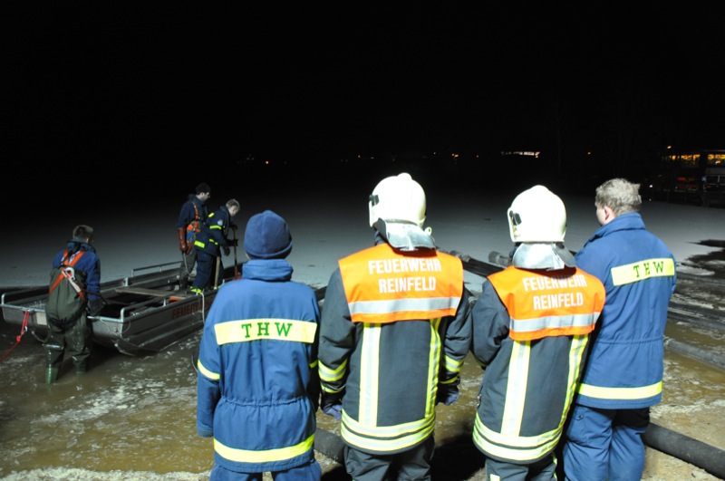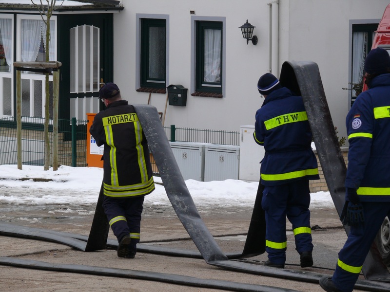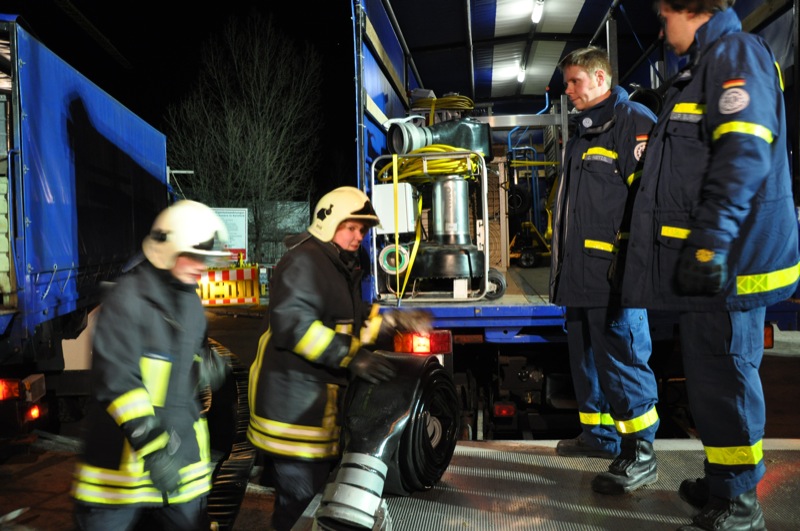 Mittwoch, 03.02.2010 Am Mittwochmorgen rief die Stadtverwaltung erneut beim Wehrführer an und teilte mit, dass das Wasser weiter gestiegen sei und jetzt auch an einer anderen Stelle des Teiches überzulaufen drohte – mit nicht unerheblichen Folgen für die dortige Baustelle und weitere angrenzende Objekte. Der Wehrführer zog den Ortsbeauftragten des THW Bad Oldesloe, Olaf Göttsche, mit hinzu. Dieser brachte einen Experten in Sachen "Wasserschaden/Pumpen", den Zugführer des THW Mölln, mit an die Einsatzstelle. Aufgrund seiner großen Erfahrung mit solchen Ereignissen berechnete er, dass es eine Möglichkeit zur Entlastung des Wehres gebe: Man müsste behutsam anfangen zu pumpen, um das Wasser nach und nach hinter dem Wehr wieder einleiten zu können. Der Bürgermeister entschied daraufhin, das THW und die Feuerwehr in den Einsatz zu bringen. In erster Alarmierung wurden große Pumpen aus Mölln, Bad Segeberg, Hamburg-Bergedorf, Oldenburg i.H., Wismar und Elmshorn eingesetzt, so wurde eine Pumpenleistung von bis zu 40.000 Litern pro Minute erreicht. Beim Aufbau der Pumpen unterstützten die Kräfte der Feuerwehr, unter anderem beim Öffnen der noch ca. 20cm dicken Eisschicht auf dem Herrenteich. Das THW Ahrensburg war mit der Fachgruppe "Beleuchtung" ebenfalls mit im Einsatz und sorgte für eine taghelle Szenerie am Herrenteich. Zusammen mit dem THW wurde auch das DRK Reinfeld alarmiert, um heiße Getränke und eine warme Suppe zu liefern. Die Bereiche an der Mühlenau, am Kalkgraben und der Trave wurden regelmäßig kontrolliert, um schnell reagieren zu können, sollten die zusätzlichen Wassermengen nicht aufgenommen werden können.