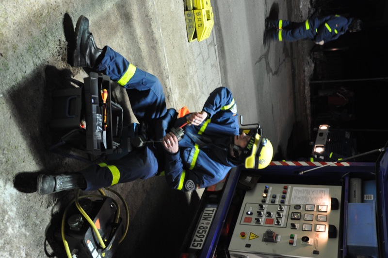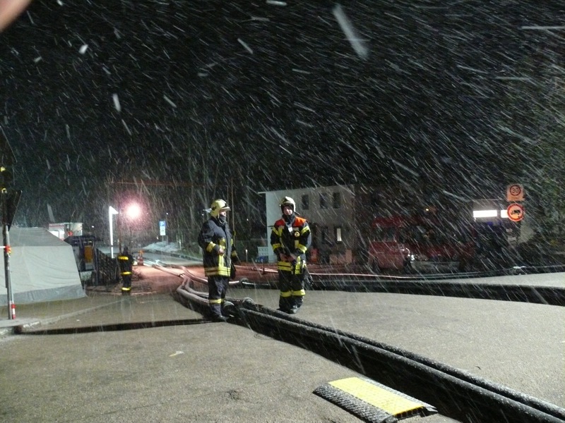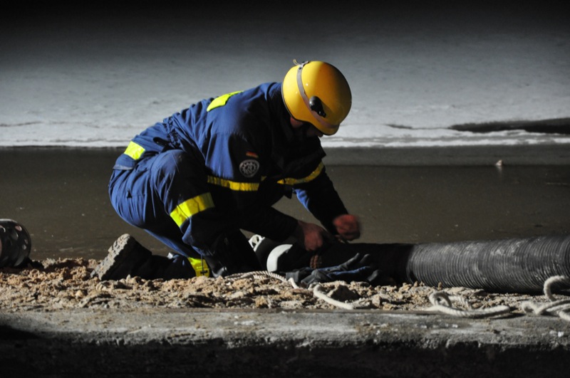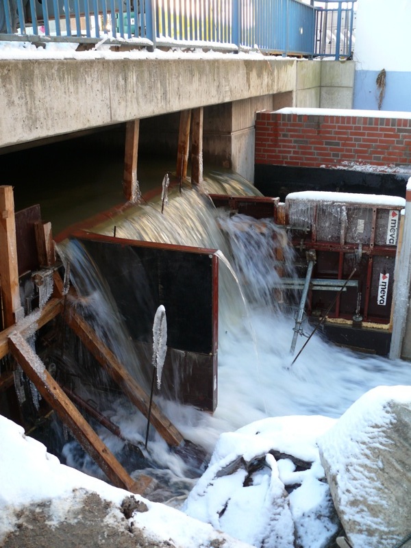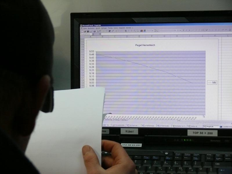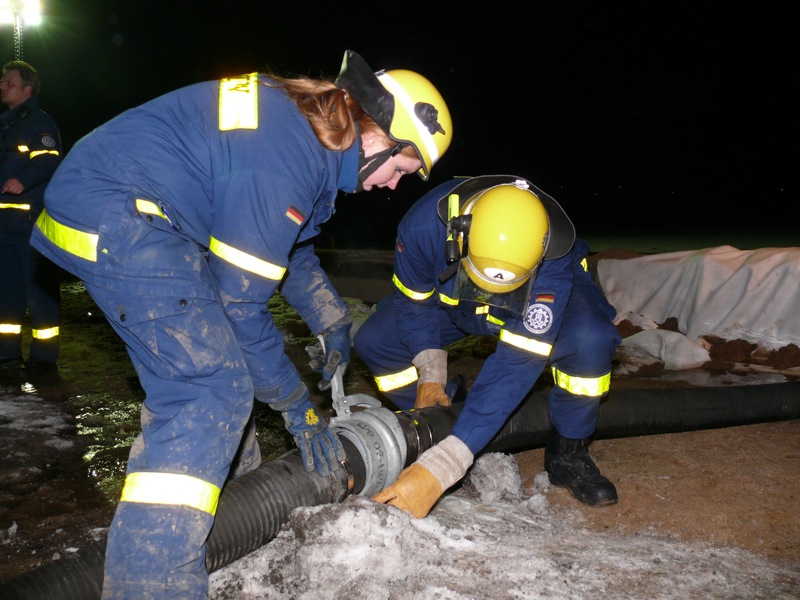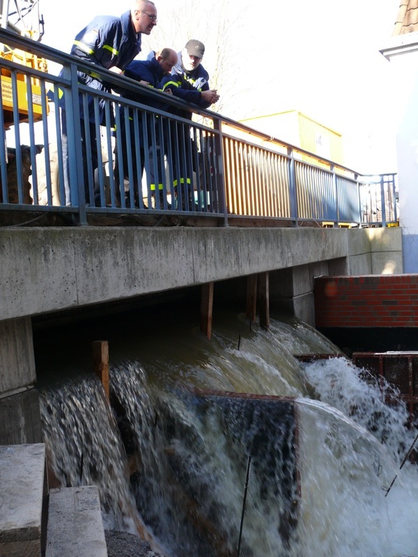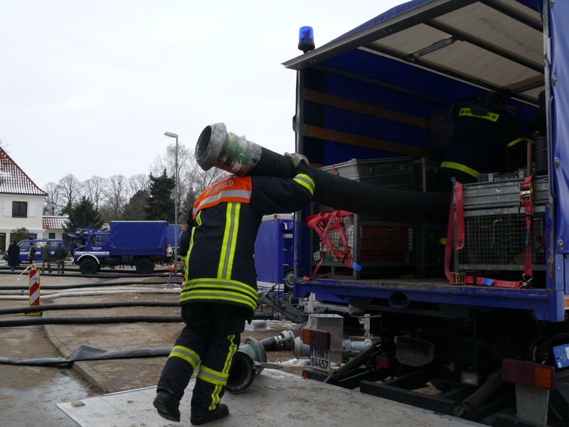 Freitag, 05.03.2010 Bis Freitag konnte der Pegel schon um insgesamt 22cm gesenkt werden, dadurch wurde erstmalig das eigentliche Wehr wieder sichtbar. Vorher war eine Beurteilung des Wehres durch die Wassermassen unmöglich. Eine Schrecksekunde dann am späten Abend: Ein Riss wurde entdeckt! Mit dem Bürgermeister und einem Vertreter der Baufirma fand umgehend eine Begutachtung statt. Das vermeintliche Leck stellte sich als alt heraus, was alle sehr beruhigte. Die Einsatzleitung entschied sich zur Alarmierung weiterer Pumpen aus Schwerin und Hamburg-Eimsbüttel.