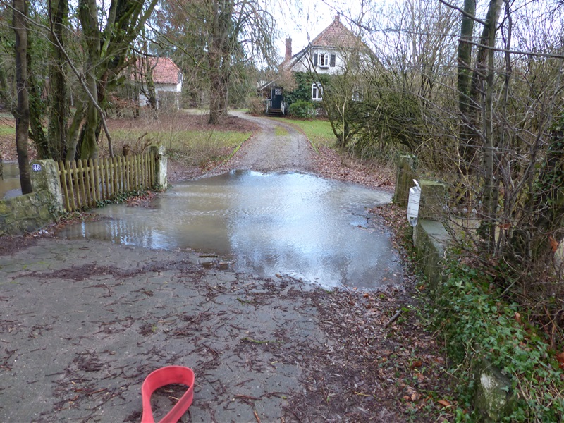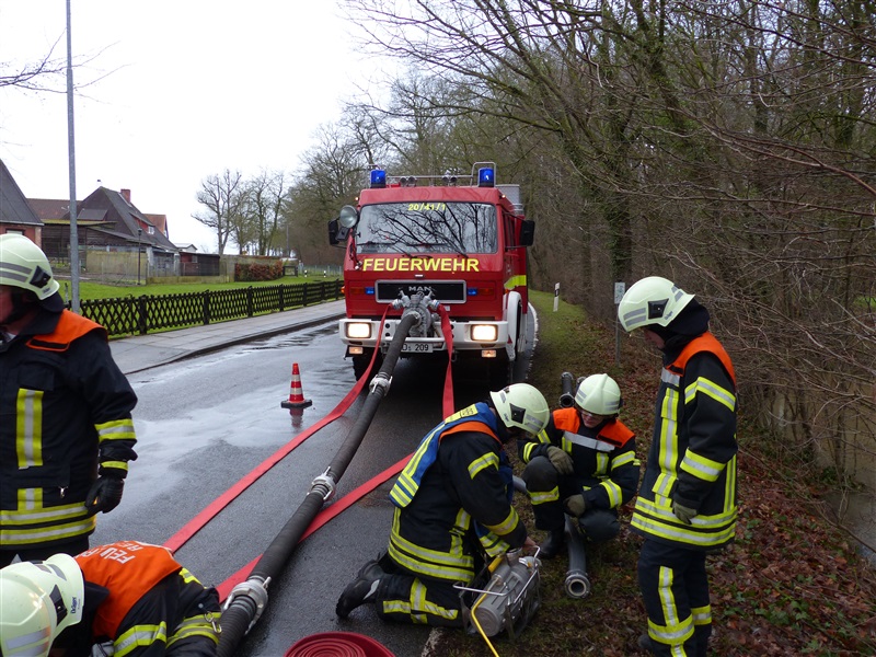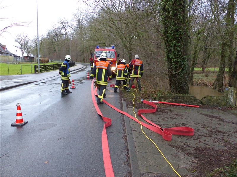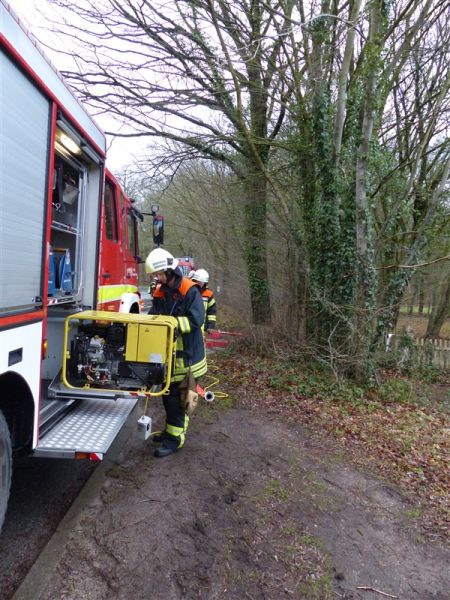 | Durch die starken Regenfälle kam es zu einer Überflutung von zwei Grundstücken, das Wasser drohte in die Keller zu laufen. Grund war ein verstopftes Rohr in einem Graben. Es wurde versucht, das Rohr von Ästen usw. zu befreien, dies gelang aufgrund des hohen Wasserdrucks nicht. Um ein weiteres Ansteigen zu verhindern wurde um das Rohr herum gepumpt, zeitweise mehr als 3000 Liter pro Minute. Mit einem vom Gewässerpflegeverband angeforderten Bagger wurde dann das Rohr frei gemacht, das Wasser konnte selbstständig weiter ablaufen. |