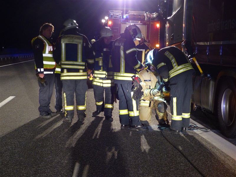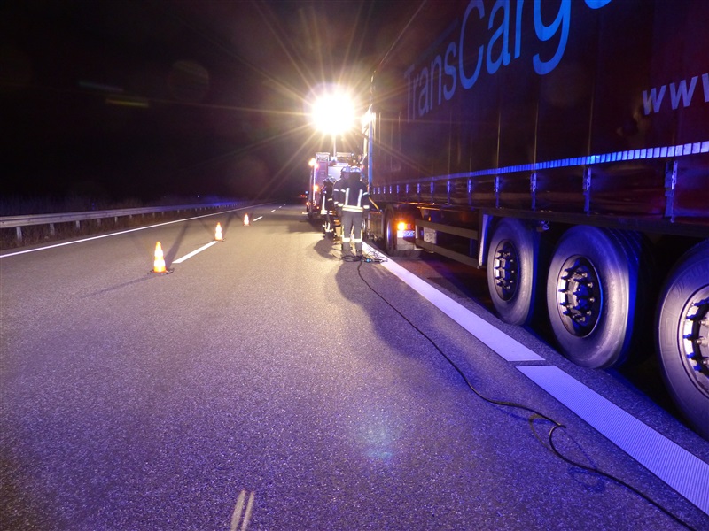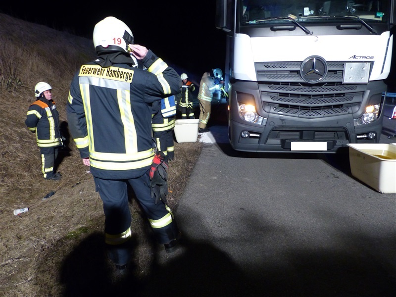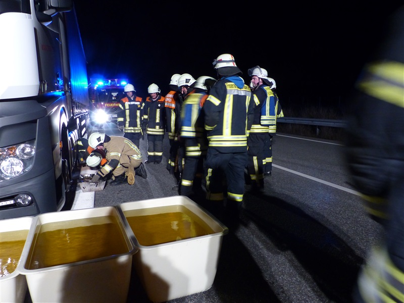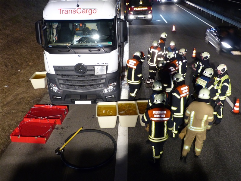 | Ein Sattelschlepper verlor auf der BAB 20 in Fahrtrichtung Segeberg eine größere Menge Diesel. Wir unterstützten die Feuerwehr Hamberge beim Auffangen und Umpumpen des Kraftstoffes in seperate Behältnisse. |