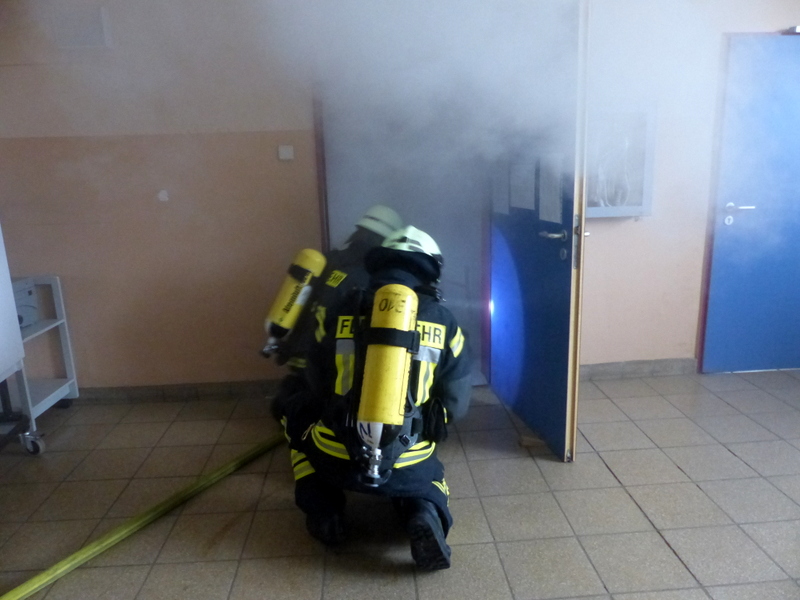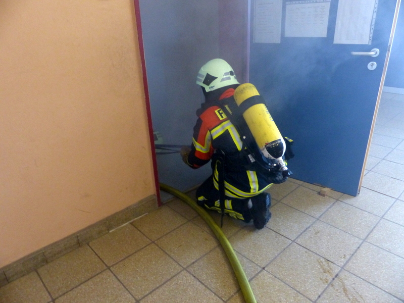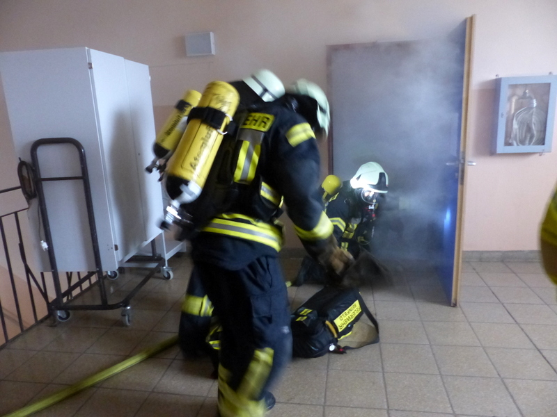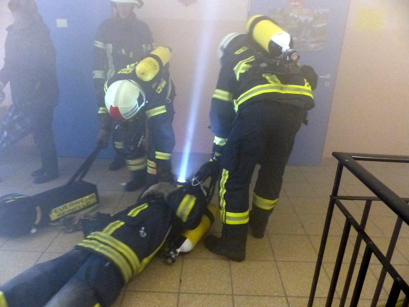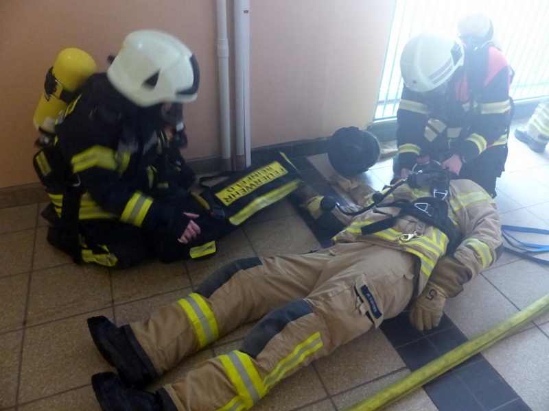 Weiter ging es dann nach etwas Theorie und dem Mittag mit den praktischen Notfallübungen. Der Angriffstrupp ging zur simulierten Brandbekämpfung in ein Gebäude vor, jedoch stellte ein Mitglied des Angriffstrupps ein Fehler an seinem Atemschutzgerät fest, er bekommt keine Luft mehr. Nach kurzer Zeit kam dann der Notruf über Funk: "Mayday, Mayday, Mayday!"