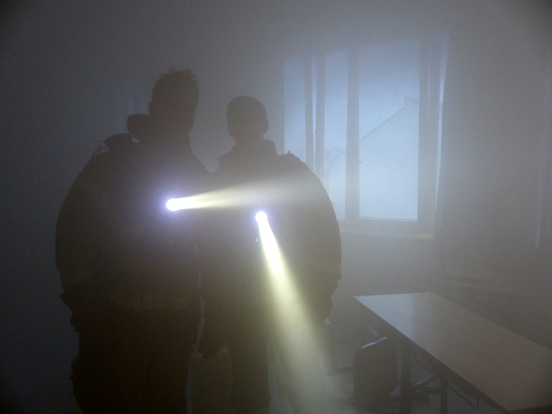 Entlang der Schlauchleitung des verunfallten Trupps bahnte sich der Rettungstrupp den Weg durch den Raum - alles ohne auch nur einen Zentimeter sehen zu können, um die Atemschutzgeräteträger neben der körperlichen Belastung auch psychisch unter Druck zu setzen.