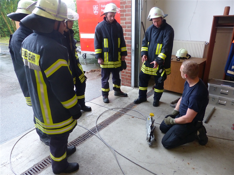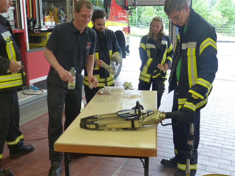 Bei uns wurde das Thema "Technische Hilfeleistung" behandelt, nach einer kurzen theoretischen Einweisung ging es in die Praxis. An drei Stationen wurde der Umgang mit dem hydraulischen Rettungsgerät, dem Mehrzweckseilzug und der LKW-Rettungsplattform / Schienenrolli geübt.