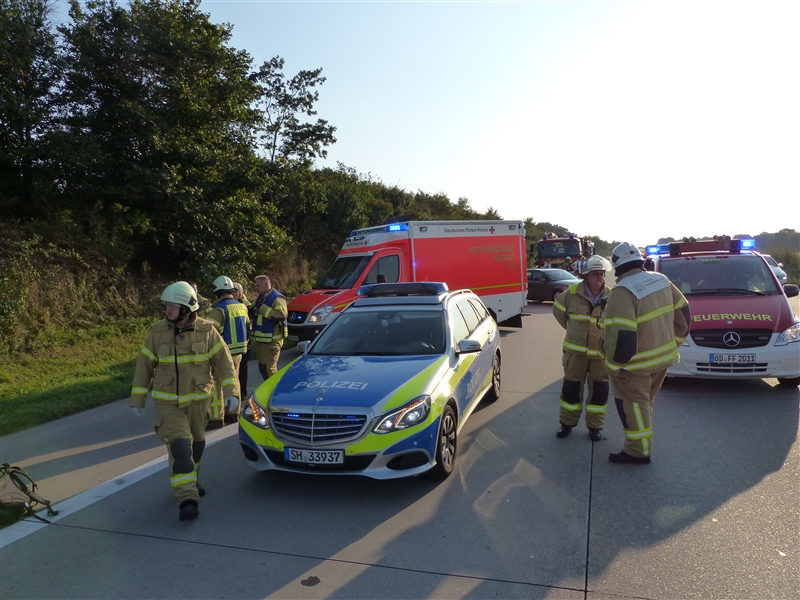 | Die Feuerwehr Reinfeld wurde zu einem Verkehrsunfall mit eingeklemmter Person auf die Autobahn 1 alarmiert. Vor Ort stellte sich heraus, dass keine Person eingeklemmt war. Die insgesamt vier Insassen des PKW wurden bis zum Eintreffen des Rettungsdienstes betreut, außerdem wurde die Polizei bei der Bergung des PKW unterstützt. |