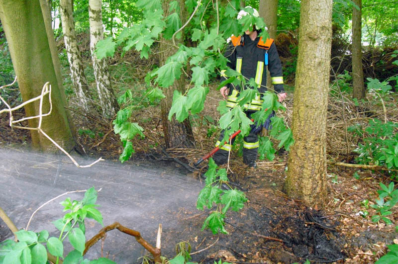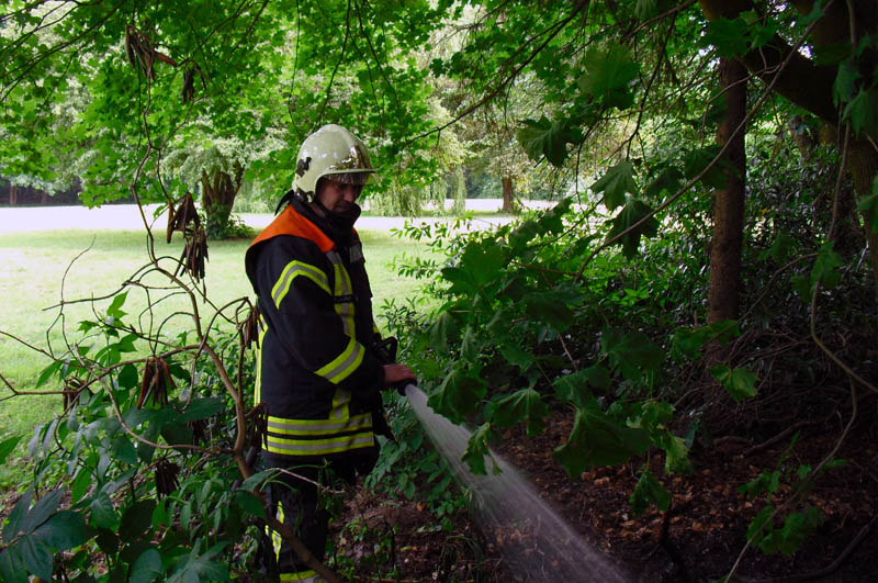 | Anwohner in der Schillerstraße hatten der Leitstelle ein Feuer in einem "Wäldchen" im alfaPark gemeldet, konnten dieses bis zum Eintreffen der Löschfahrzeuge jedoch schon fast selbstständig löschen. Es waren demnach nur Nachlöscharbeiten der verbrannten Fläche mit dem Schnellangriff erforderlich. |