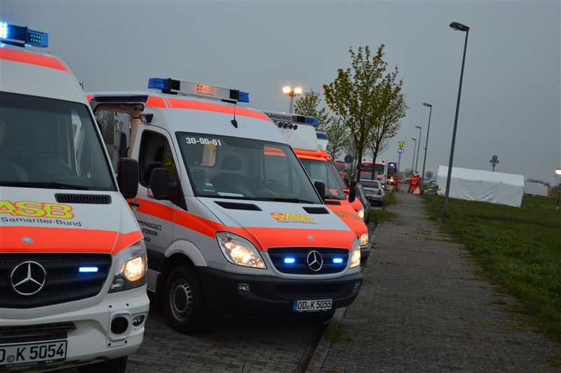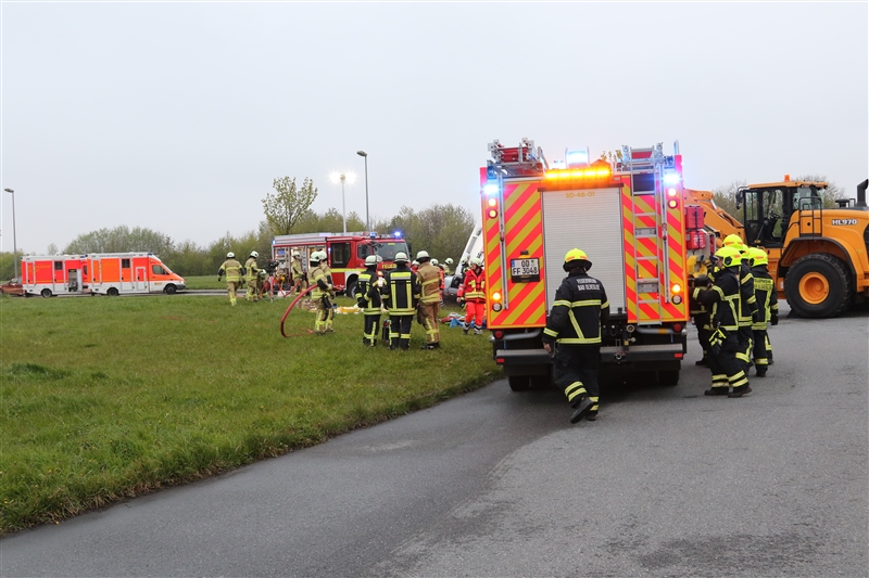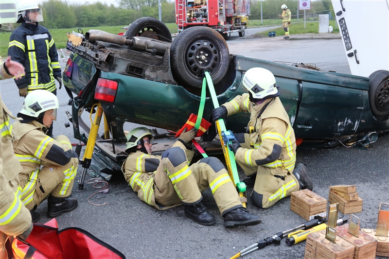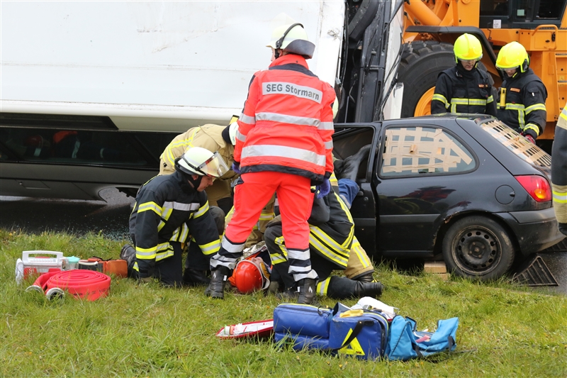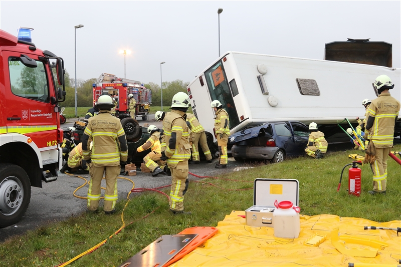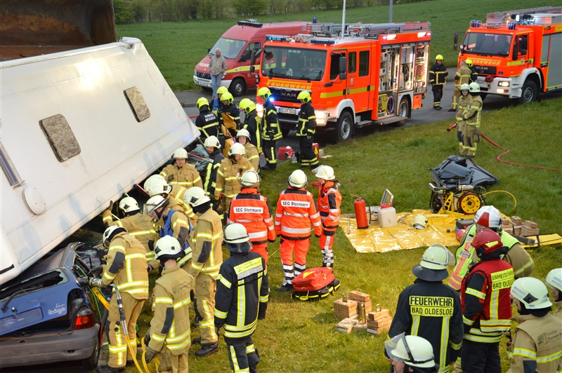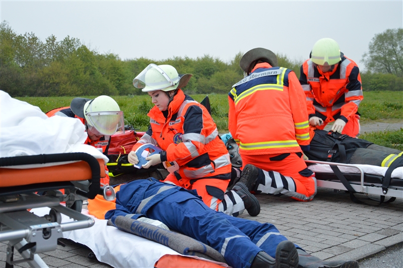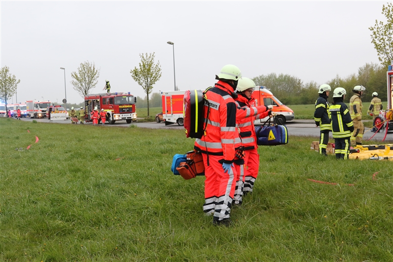 Ein Radlader und ein Bus waren zusammen gestoßen, außerdem waren noch drei PKW beteiligt - so lautete die Einsatzmeldung für diese Übung. In den PKWs waren mehrere Personen eingeklemmt, der Bus war umgestürzt und es befanden sich mehrere Verletzte darin. Gemeinsam mit den Rettungskräften des ASB und den Kameradinnen und Kameraden der Feuerwehr Bad Oldesloe wurden die Verletzten versorgt und die Eingeklemmten befreit. Wir danken den Firmen Borowski & Hopp, Wienäber und Muhlack für die Unterstützung dieser Übung!