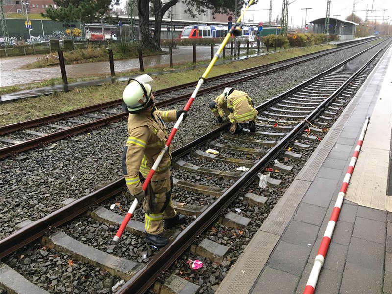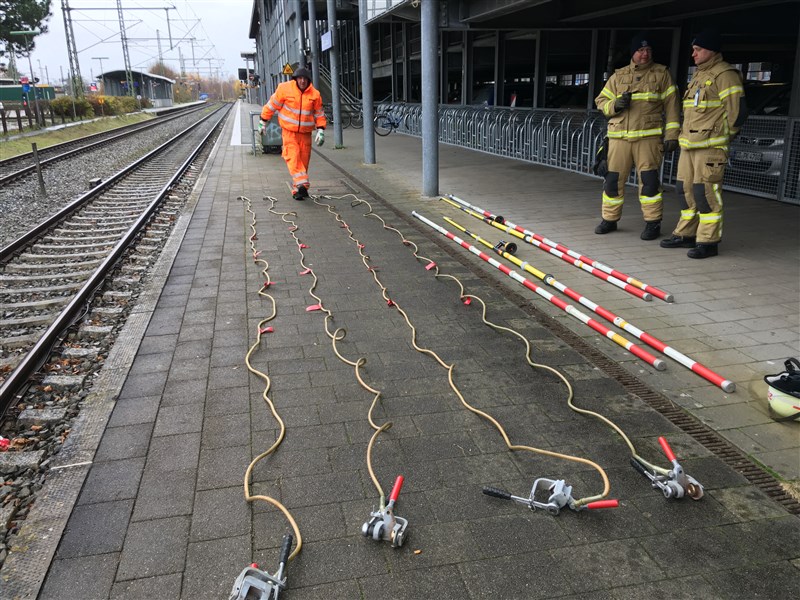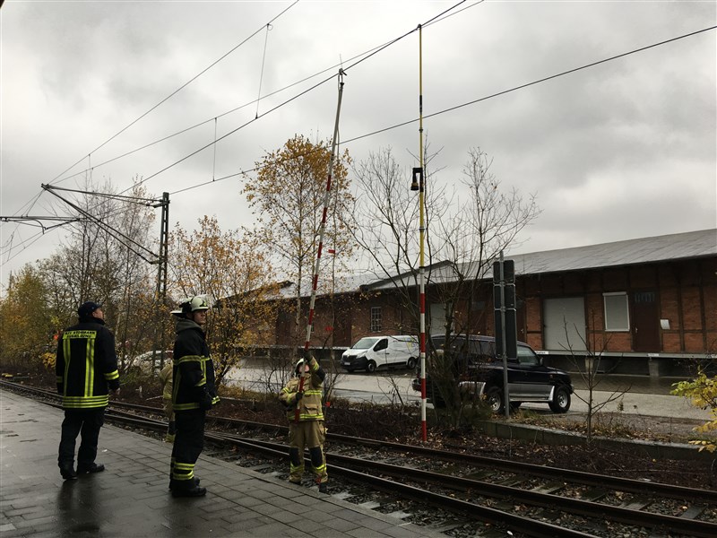 Seit der Elektrifizierung der Bahnstrecke Hamburg - Lübeck sind wir mit 2 Sätzen Bahnerdungsgeschirr ausgestattet, um bei Einsätzen an und auf der Bahnstrecke die Oberleitung erden zu können. Dies wird immer dann notwendig, wenn der Sicherheitsabstand zur 15.000 Volt führenden Oberleitung unterschritten werden muss, um den Einsatz bewältigen zu können. Beispiele hierfür sind: Verletzte Personen auf den Wagons oder auf die Oberleitung gestürzte Bäume.