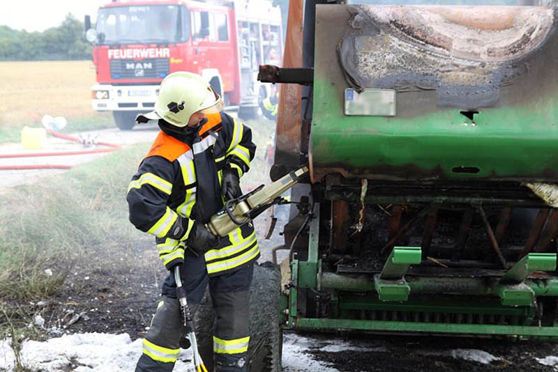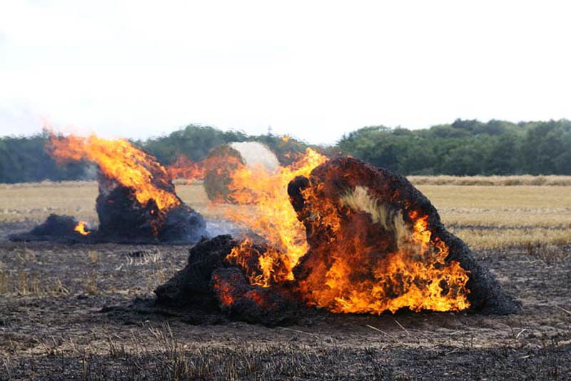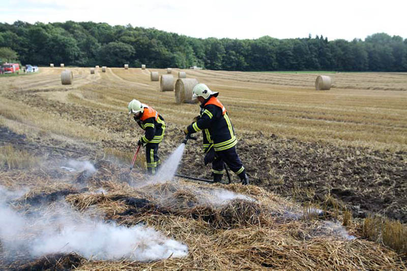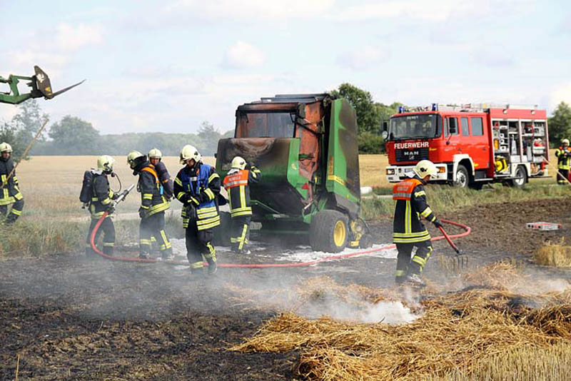 Die Feuerwehr Reinfeld wurde zur Unterstützung der Feuerwehr Rehhorst alarmiert. Im Bereich Voßkaten brannte eine Rundballenpresse sowie mehrere Rundballen. Durch den starken Wind wurde das Feuer angefacht und griff auf ein benachbartes Feld über. Gemeinsam mit der FF Rehhorst, der FF Pöhls und der FF Zarpen wurde das Feuer gelöscht. Bilder: Oliver Renter |