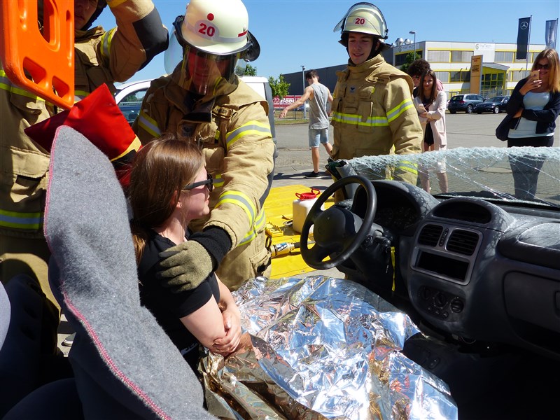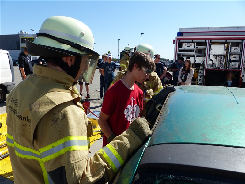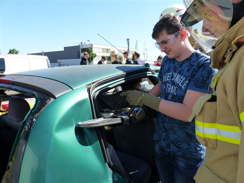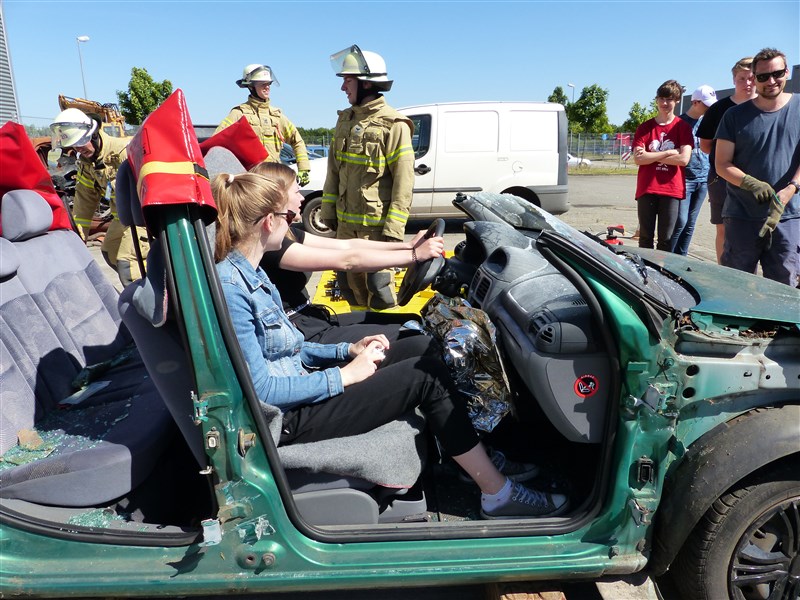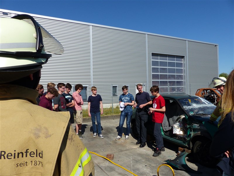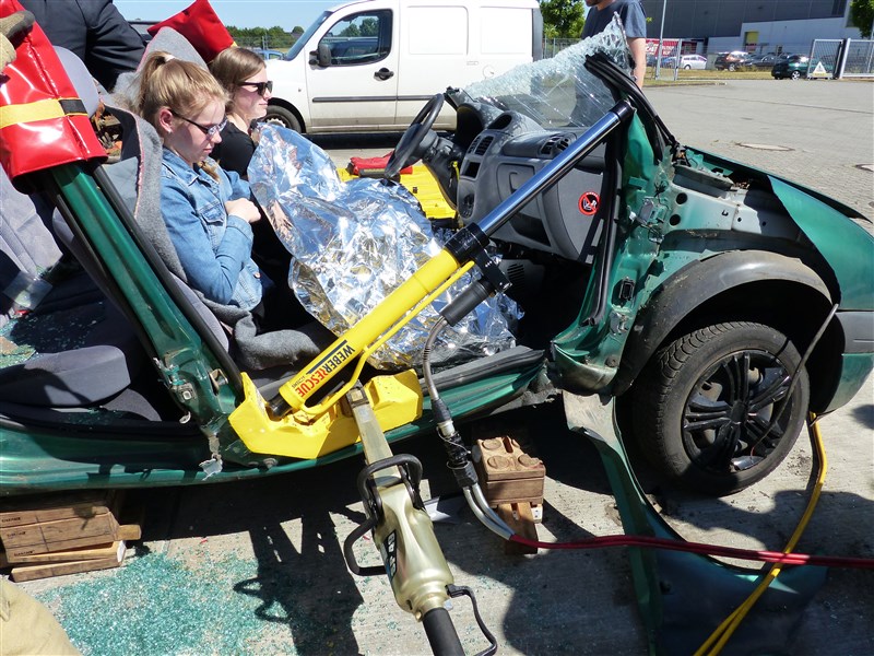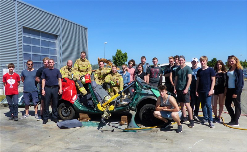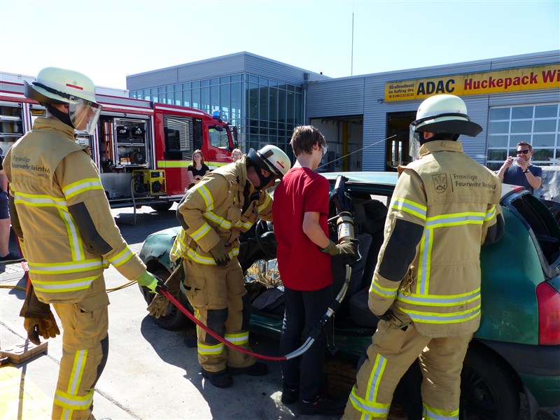 Als Highlight fand sich die Projektgruppe am Donnerstag Vormittag auf dem Gelände der Fa. Huckepack Wiek ein. Hier demonstrierten wir an einem bereitgestellten PKW die patientengerechte Rettung. Die Schüler hatten so die Möglichkeit, sich in die Rolle einer zu rettenden Person zu versetzen, während um sie herum Teile des Fahrzeug mit schweren hydraulischen Rettungsgerät entfernt wurden. Jeder Schritt der technischen Rettung wurden durch Wehrführer Gerd-Heinrich Riemann und den stellv. Gruppenführer Nico Rösler erklärt und anschließend unter weiterer Anleitung und Hilfe durch uns, zusammen mit den Schülern durchgeführt. Für alle teilnehmenden Schüler ein spannendes Erlebnis, selbst einen Eindruck über die Kraft und Einsatzmöglichkeiten der Geräte zu erlangen.