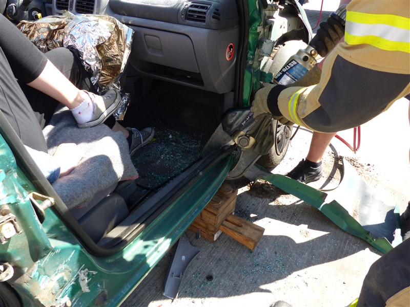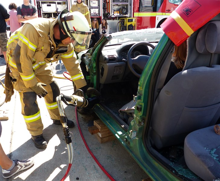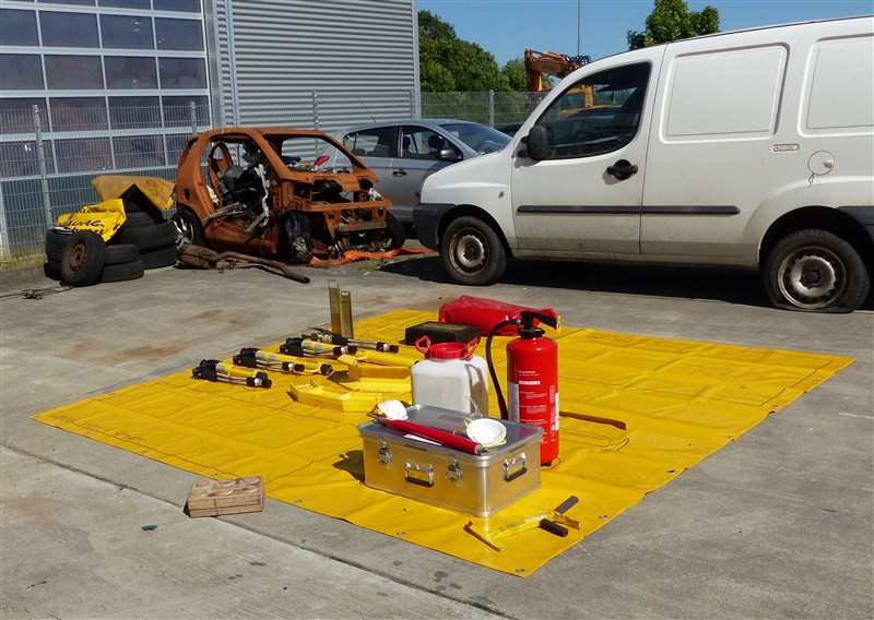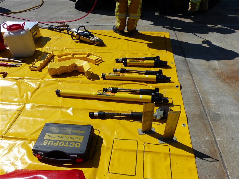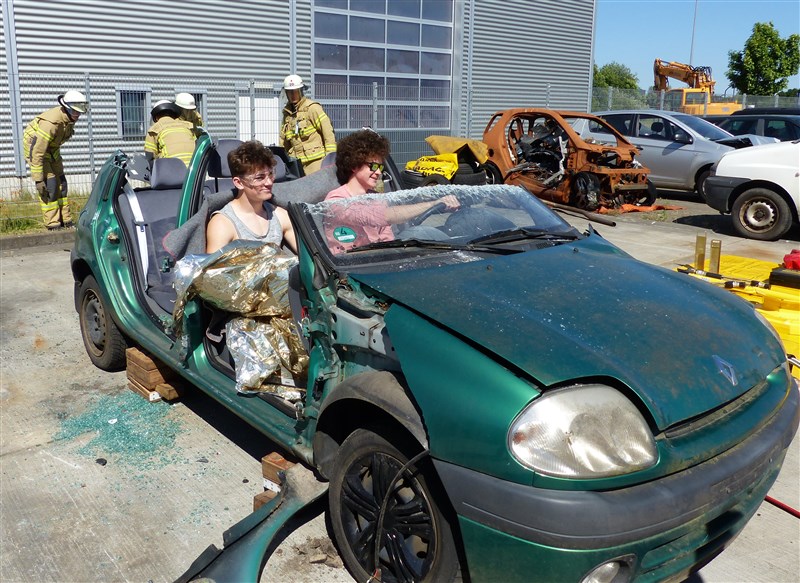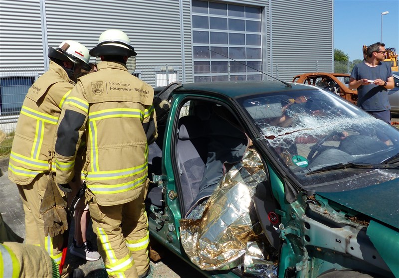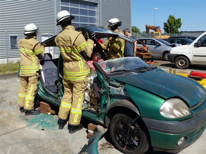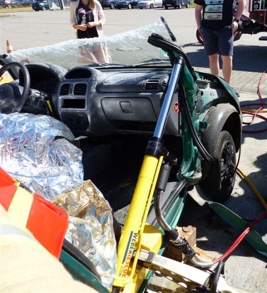 Als Highlight fand sich die Projektgruppe am Donnerstag Vormittag auf dem Gelände der Fa. Huckepack Wiek ein. Hier demonstrierten wir an einem bereitgestellten PKW die patientengerechte Rettung. Die Schüler hatten so die Möglichkeit, sich in die Rolle einer zu rettenden Person zu versetzen, während um sie herum Teile des Fahrzeug mit schweren hydraulischen Rettungsgerät entfernt wurden. Jeder Schritt der technischen Rettung wurden durch Wehrführer Gerd-Heinrich Riemann und den stellv. Gruppenführer Nico Rösler erklärt und anschließend unter weiterer Anleitung und Hilfe durch uns, zusammen mit den Schülern durchgeführt. Für alle teilnehmenden Schüler ein spannendes Erlebnis, selbst einen Eindruck über die Kraft und Einsatzmöglichkeiten der Geräte zu erlangen.