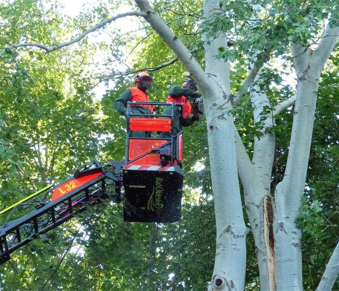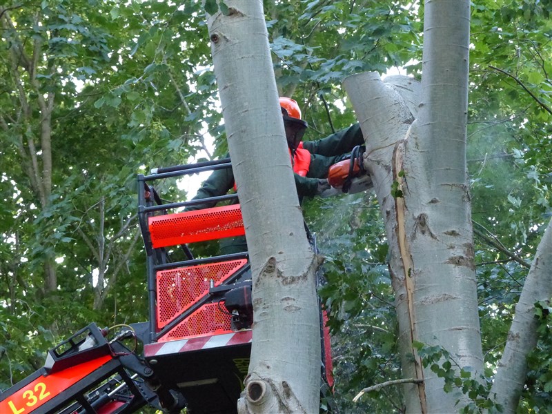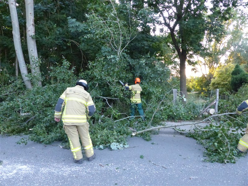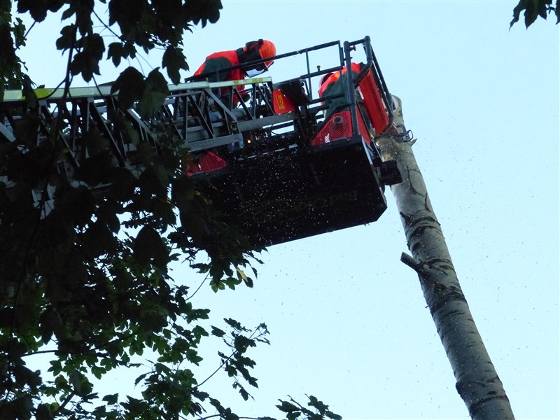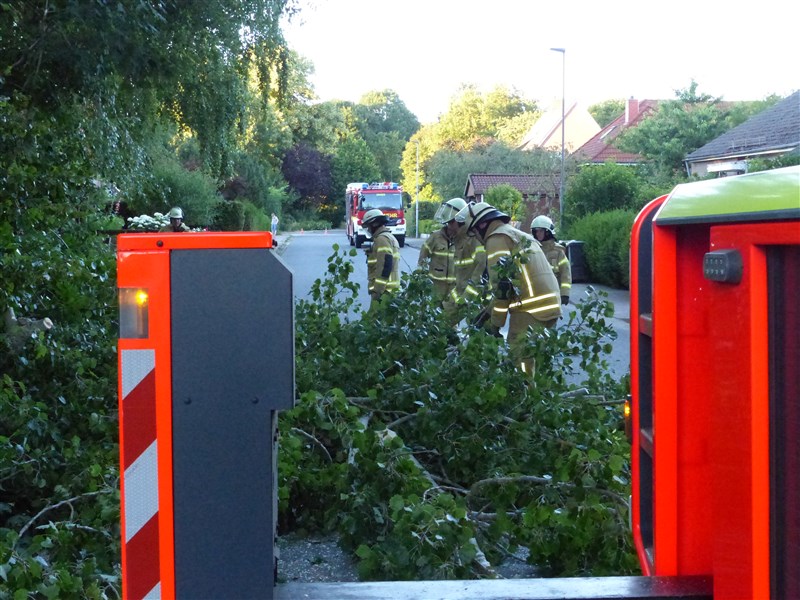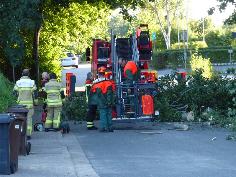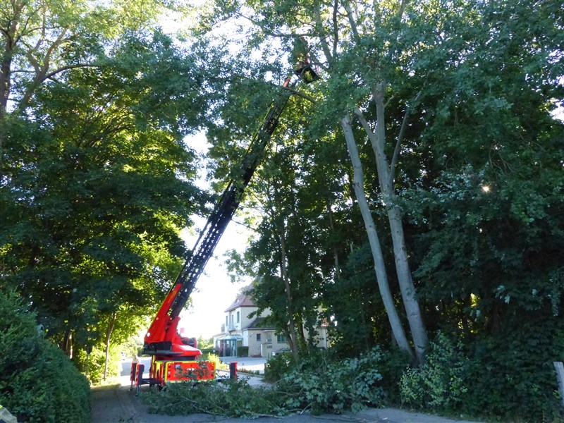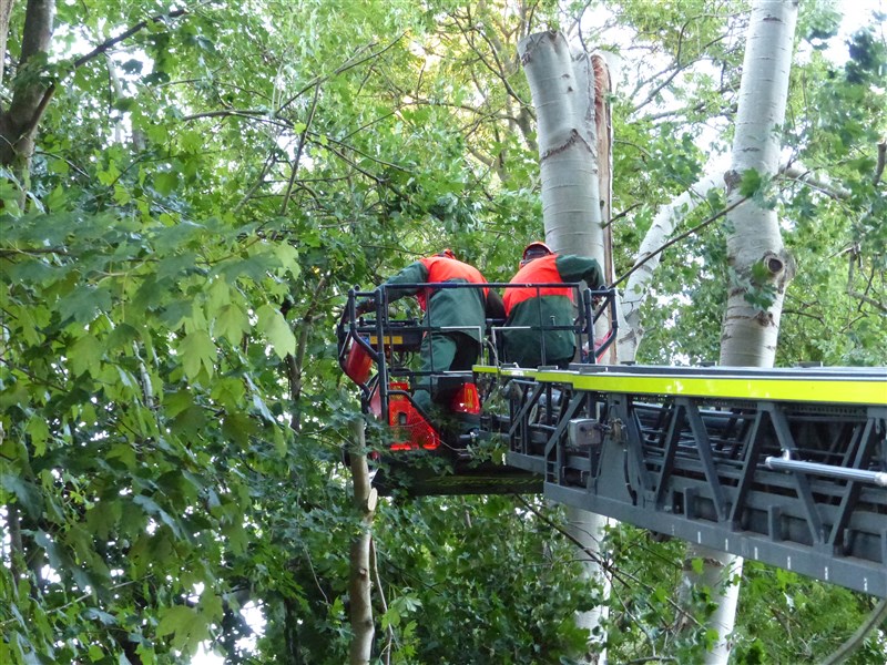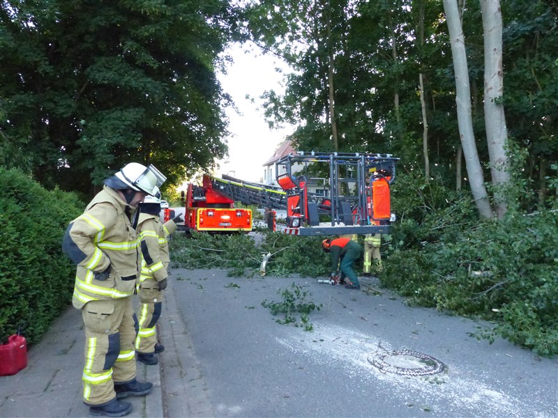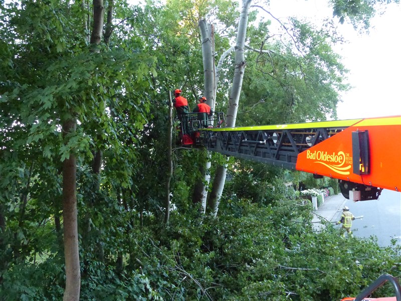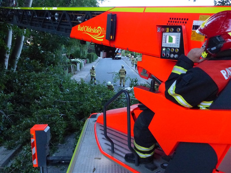 Ein aufgespaltener, etwa 25 Meter hoher Baum drohte auf die Straße zu stürzen. Zusammen mit der Freiwilligen Feuerwehr Bad Oldesloe und ihrer Drehleiter wurde der Baum, mittels Kettensäge soweit zurückgeschnitten, dass von ihm keine Gefahr mehr ausging. Im Anschluss wurden die abgesägten Äste von Straße und Fußweg beseitigt.