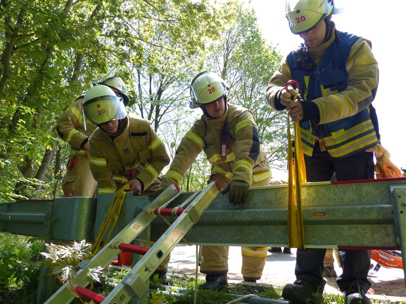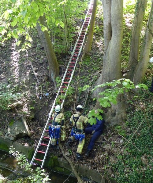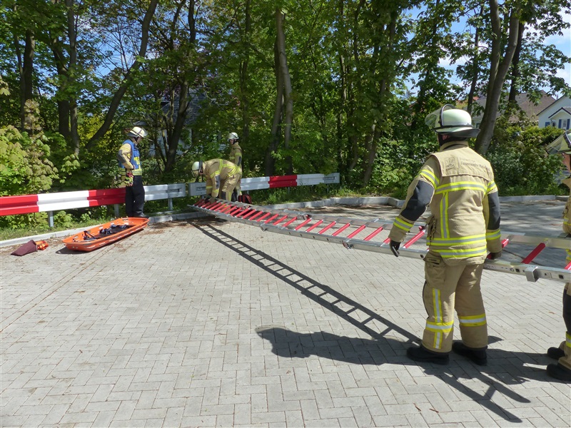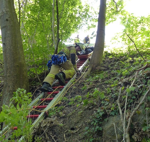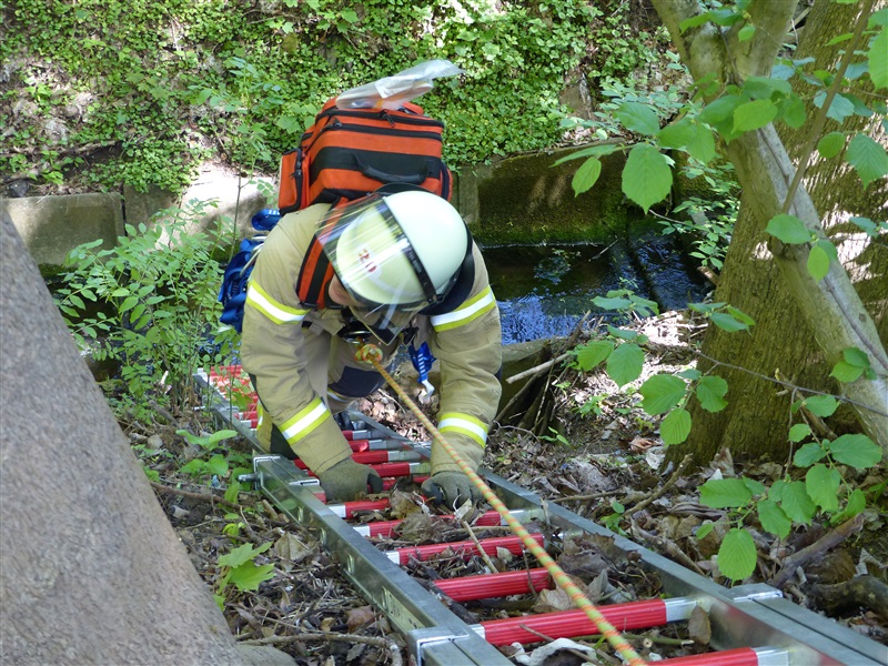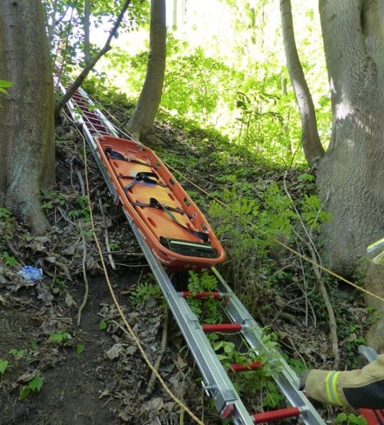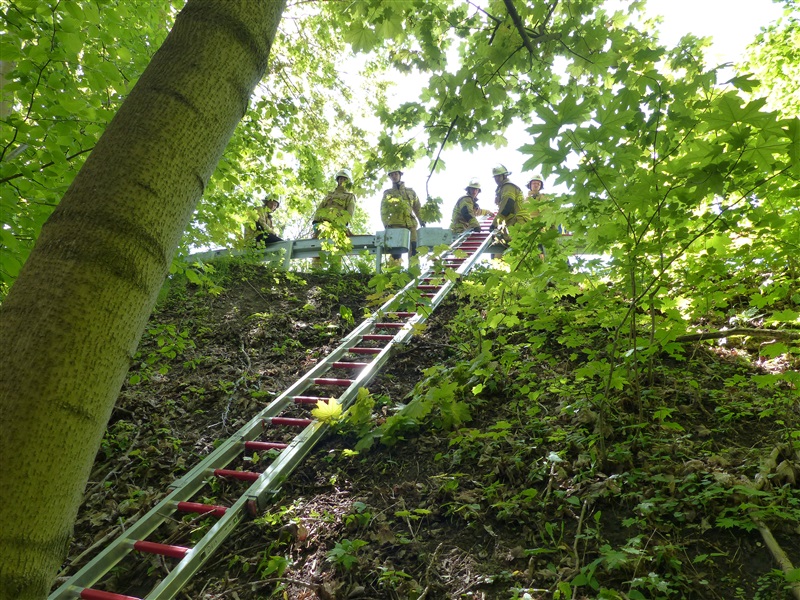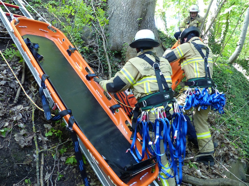 In dieser Lage musste eine verletzte Person möglichst schonend an einem steilen Hang gerettet werden. Unter Zuhilfenahme mehrerer Steckleiterteile verschaffte sich die Besatzung des Löschfahrzeugs Zugang zu der Person und führte mit unserem Rettungsrucksack die Erstversorgung durch. Der Trupp sicherte sich selbst mit dem Gerätesatz „Absturzsicherung“. Nach erfolgter Versorgung wurde die verletzte Person anschließend mit der Schleifkorbtrage den Hang hinaufgezogen. Bei dieser Variante dienen die Steckleiterteile zusätzlich als eine Art „Schienensystem“, auf welchen die Schleifkorbtrage an Leinen hinaufgezogen wird.