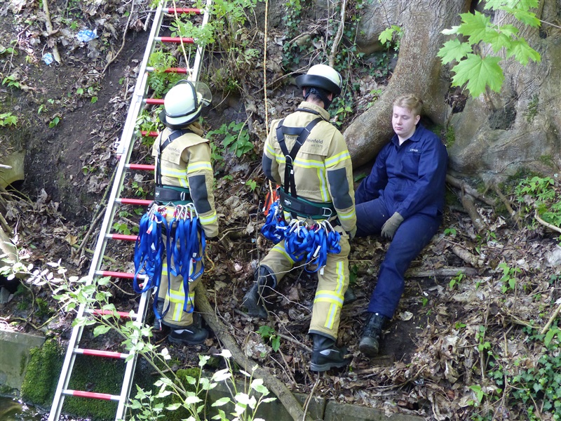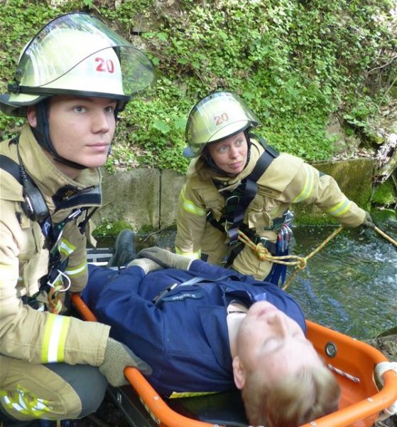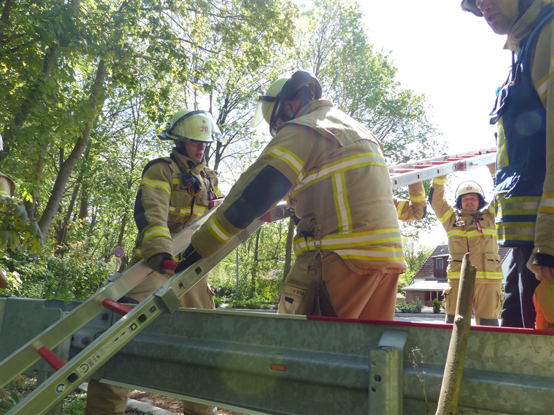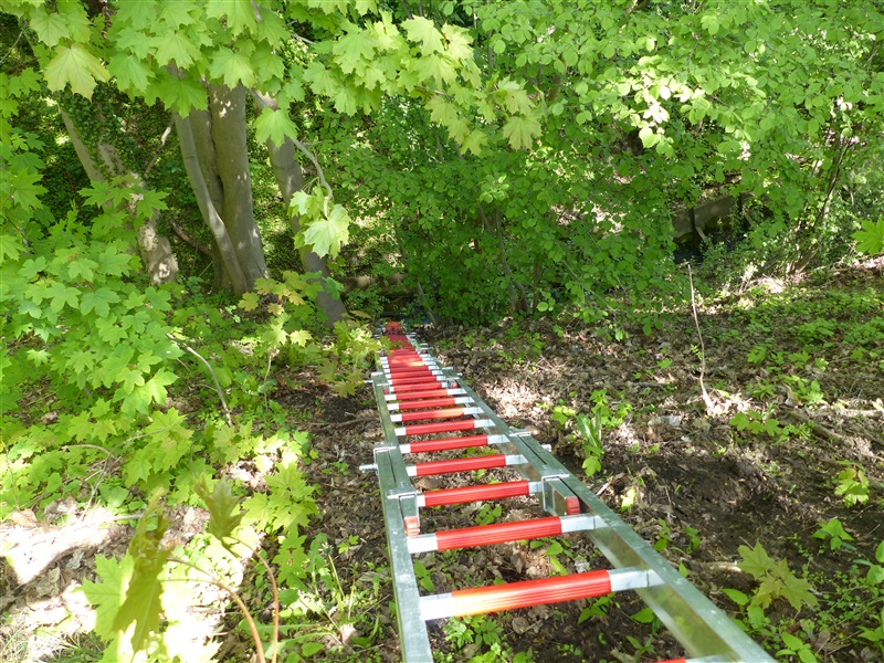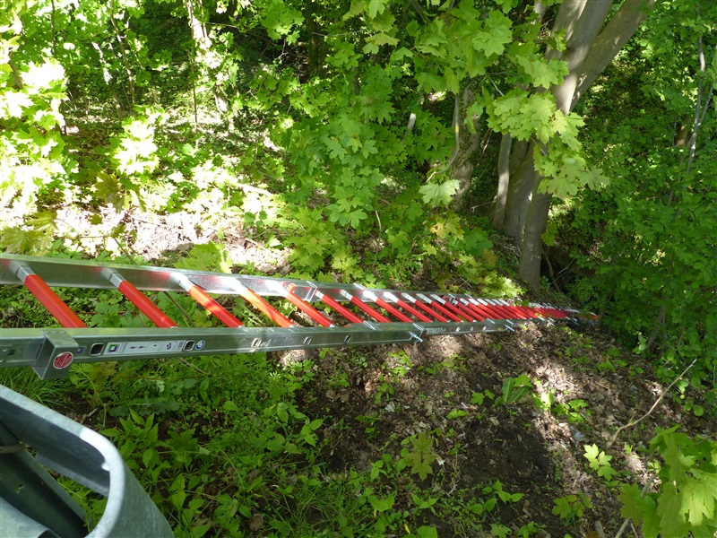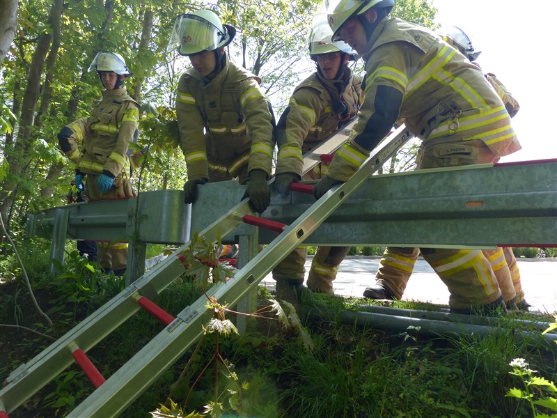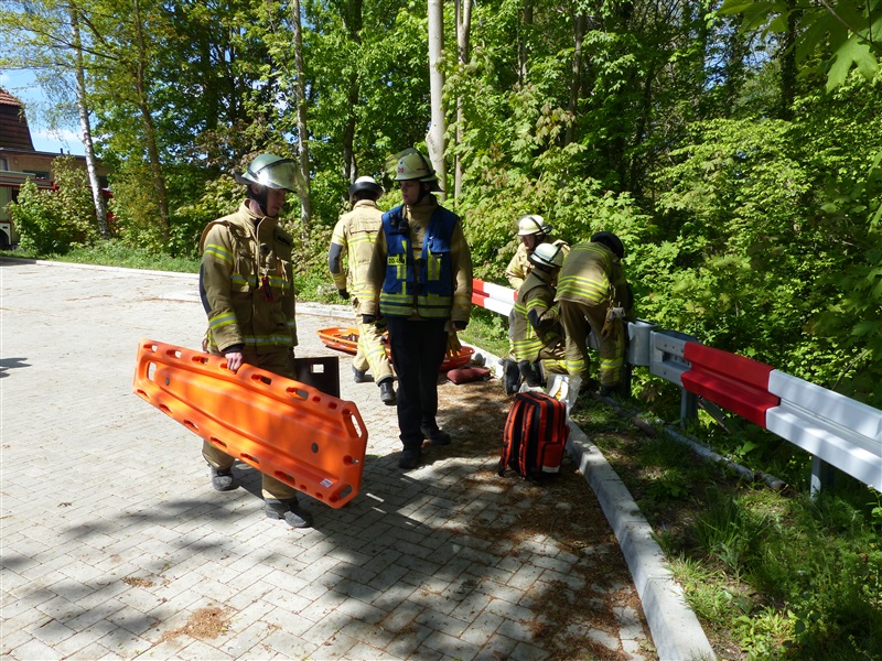 In dieser Lage musste eine verletzte Person möglichst schonend an einem steilen Hang gerettet werden. Unter Zuhilfenahme mehrerer Steckleiterteile verschaffte sich die Besatzung des Löschfahrzeugs Zugang zu der Person und führte mit unserem Rettungsrucksack die Erstversorgung durch. Der Trupp sicherte sich selbst mit dem Gerätesatz „Absturzsicherung“. Nach erfolgter Versorgung wurde die verletzte Person anschließend mit der Schleifkorbtrage den Hang hinaufgezogen. Bei dieser Variante dienen die Steckleiterteile zusätzlich als eine Art „Schienensystem“, auf welchen die Schleifkorbtrage an Leinen hinaufgezogen wird.