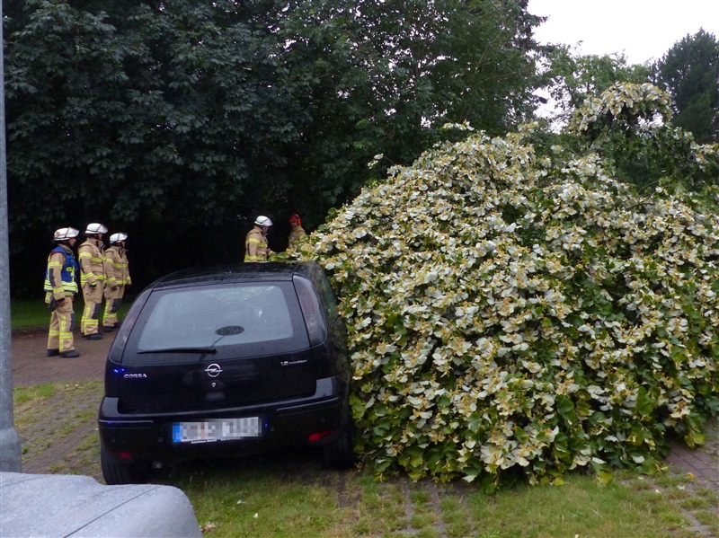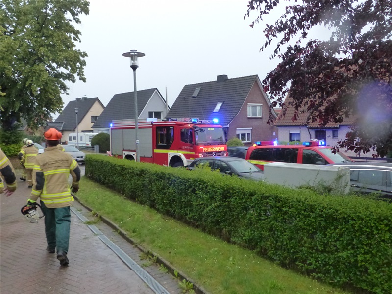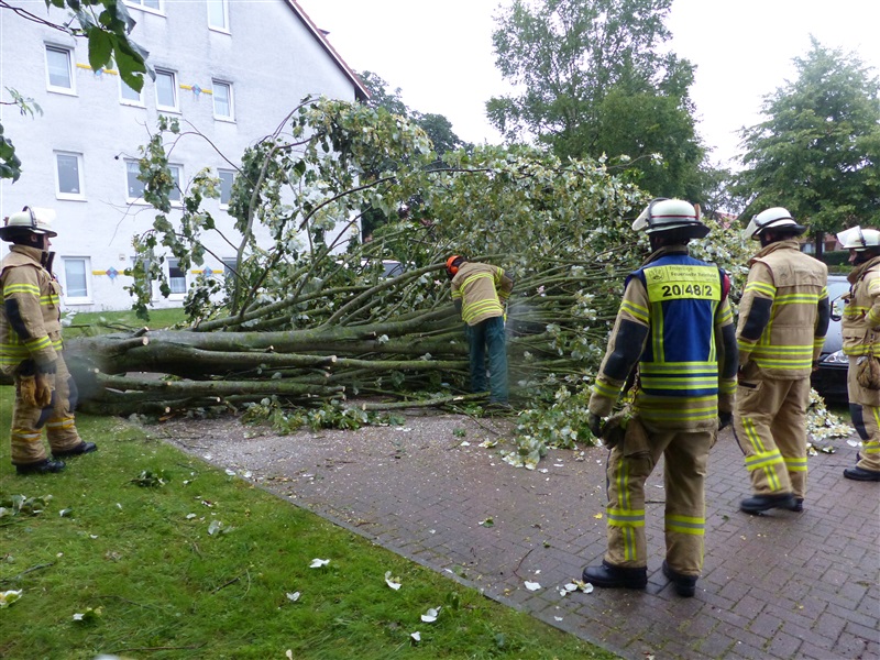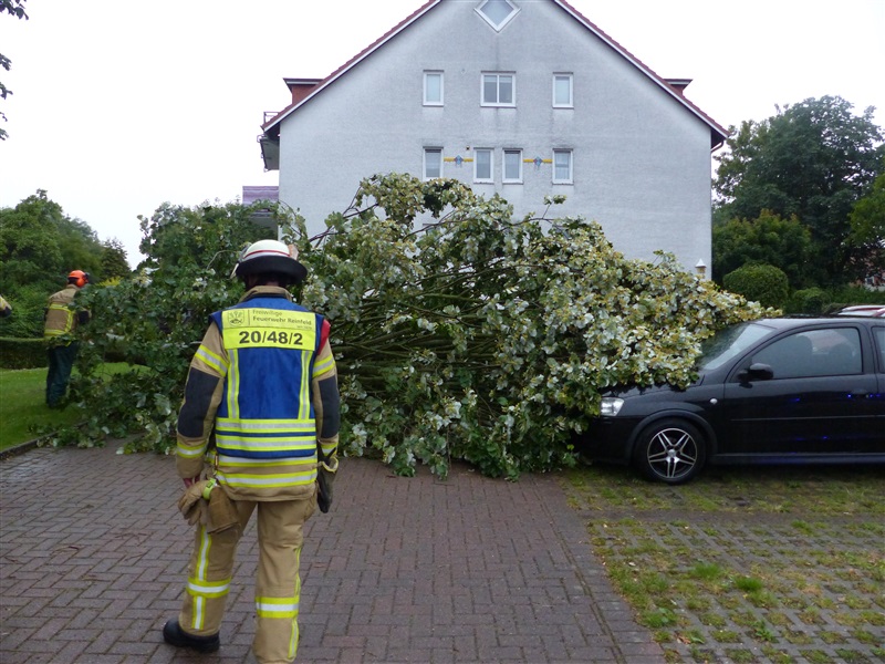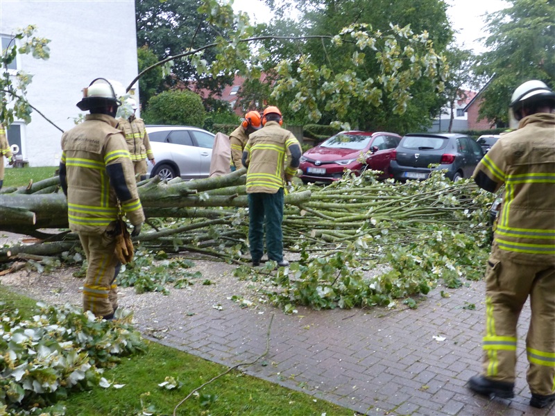 Ein größerer Baum hielt einer Windböe nicht mehr stand und fiel auf einen geparkten PKW. Mittels zweier Kettensägen wurde der Baum von dem Fahrzeug entfernt und der PKW nach Abschluss der Arbeiten an den Besitzer übergeben.
