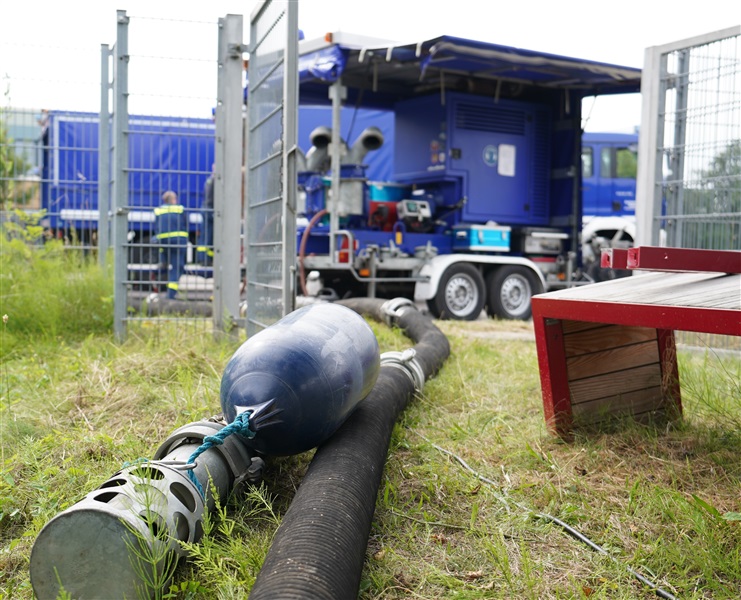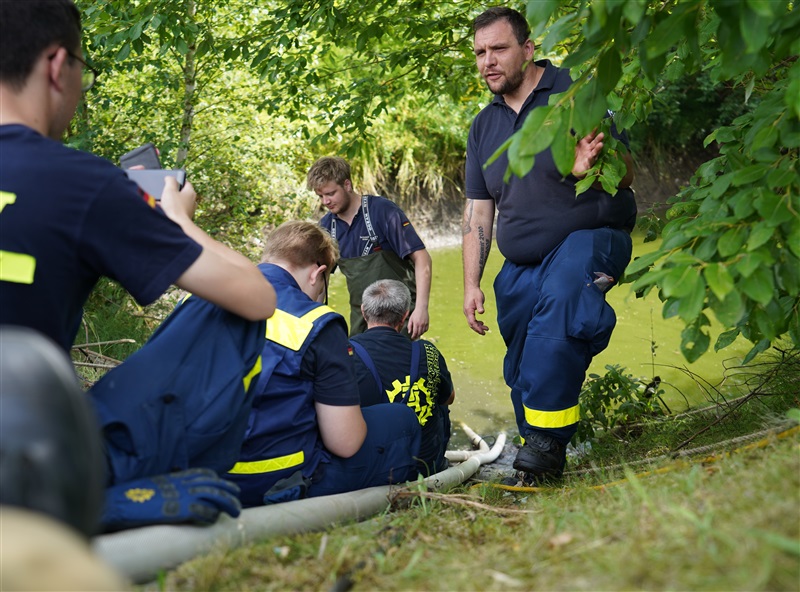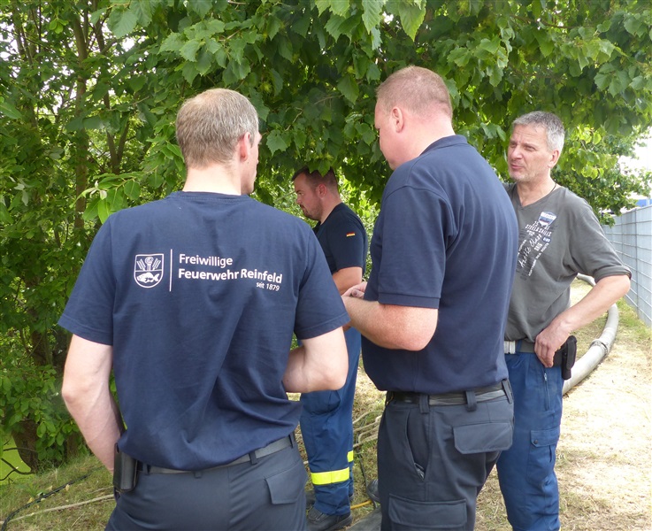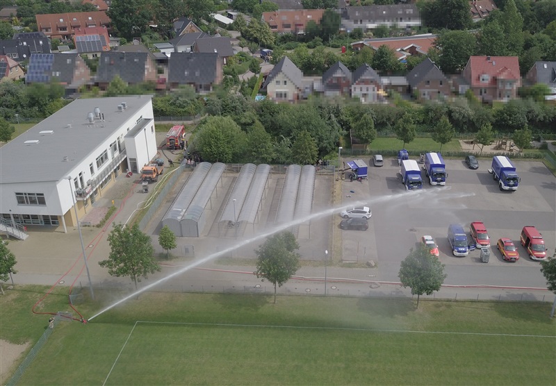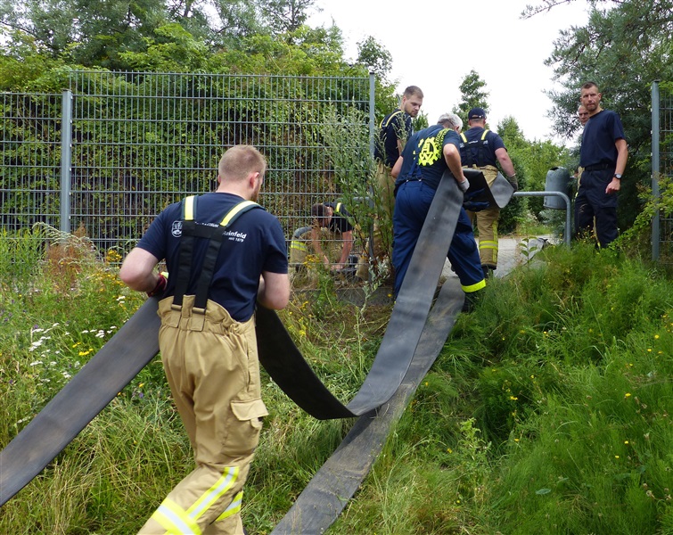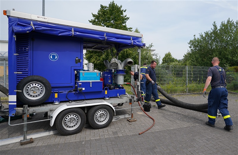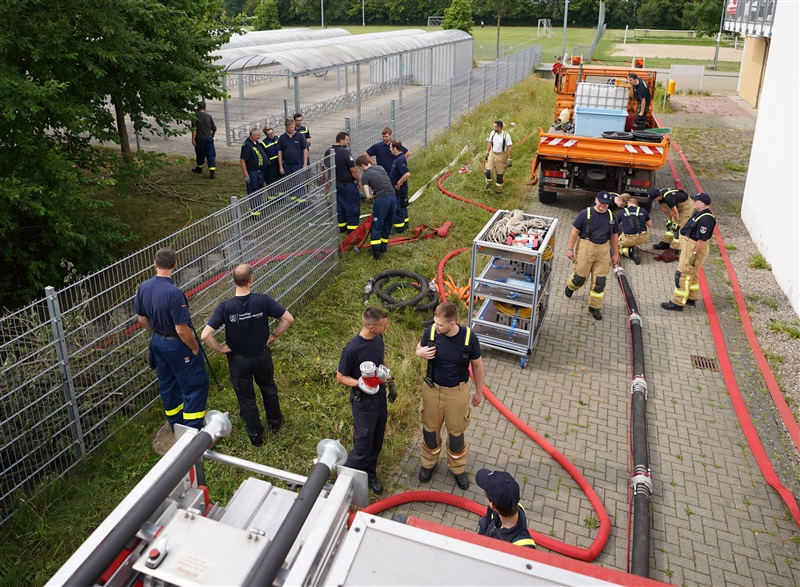 Wir nutzten diese Gelegenheit zum einen für die Ausbildung an unserer eigenen Pumpe des Löschfahrzeugs, sowie um die Möglichkeiten und technische Ausstattung des THW in Sachen Pumpen kennenzulernen. Das THW brachte mehrere Schmutzwasserpumpen mit einer Leistung von jeweils 2000 Liter/Minute, sowie eine Hochleistungspumpe vom Typ „Hannibal“ mit einer maximalen Förderleistung von 15.000 Liter/Minute in Stellung. Hierzu wurden mehrere Schlauchleitung vom Typ „B“ (75mm Durchmesser), „A“ (110mm Durchmesser) und sogar „F“ (160mm Durchmesser) verlegt, um das Wasser aus dem Becken in die Oberflächenentwässerung zu befördern. Ebenfalls kam unser mobiler Wasserwerfer zum Einsatz, mit welchen wir ein Teil des Wassers auf den Sportplatz ausbrachten.
