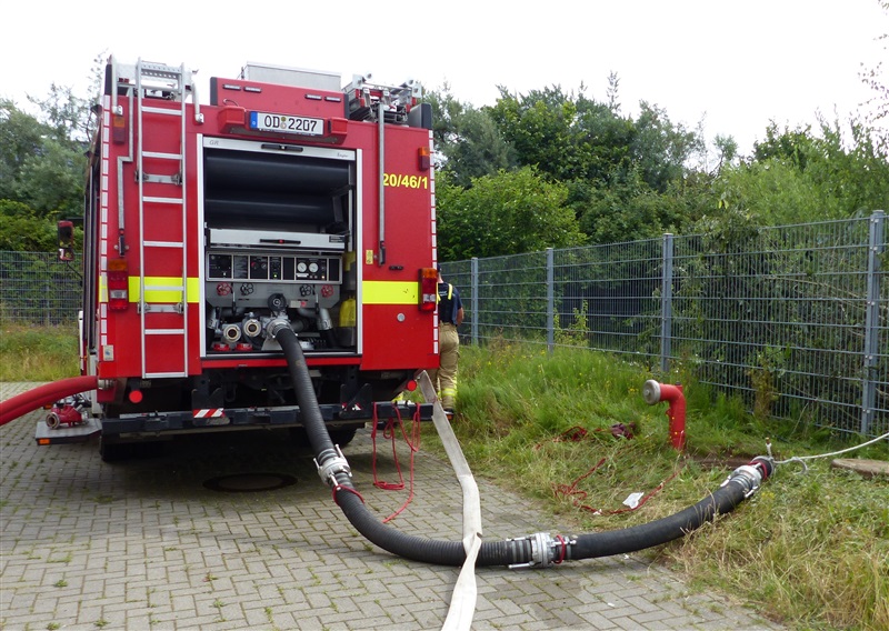Übungsobjekt war das Regenrückhaltebecken (ca. 200.000 Liter) der Immanuel-Kant-Schule, welches im Einsatzfall auch durch uns als Feuerwehr für die Löschwasserentnahme dienen soll. Auf Anfrage der Stadtverwaltung sollte das Becken für Instandhaltungs- und Sanierungsarbeiten weitestgehend leergepumpt werden.