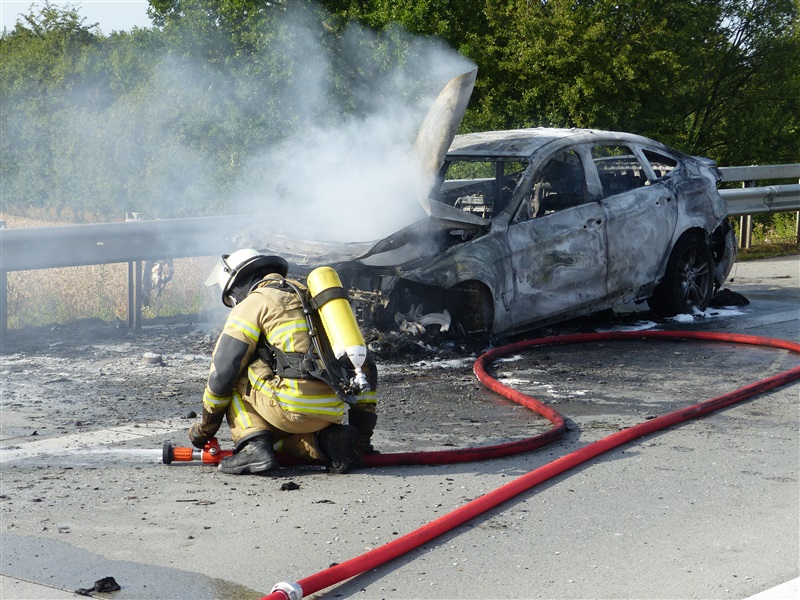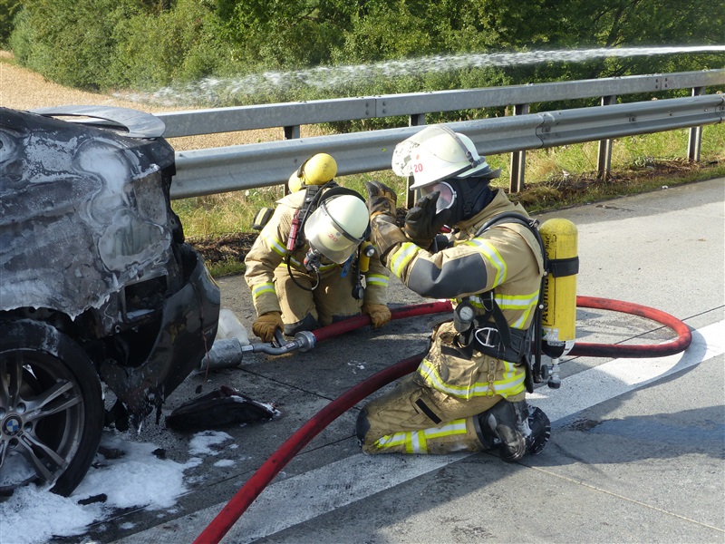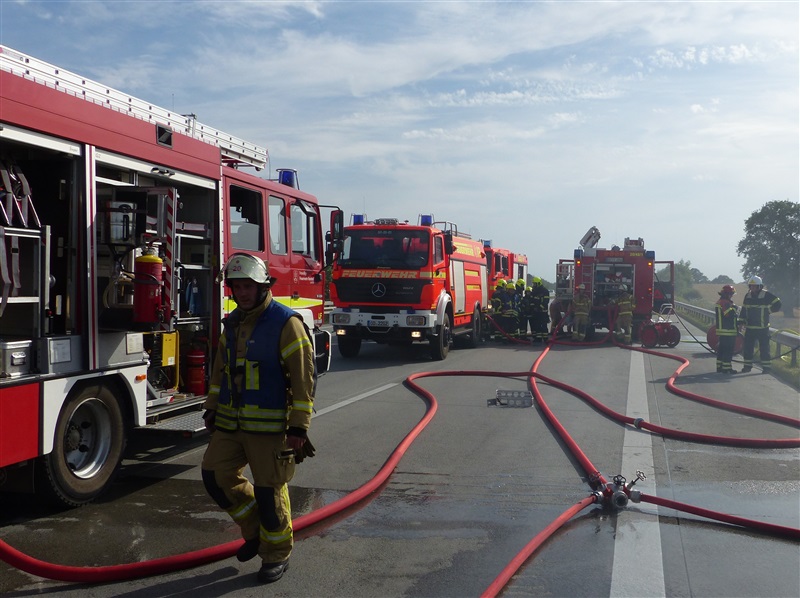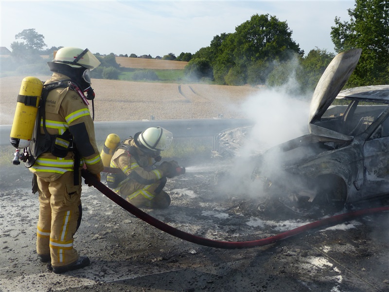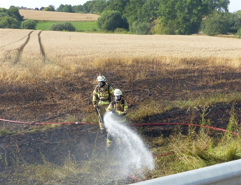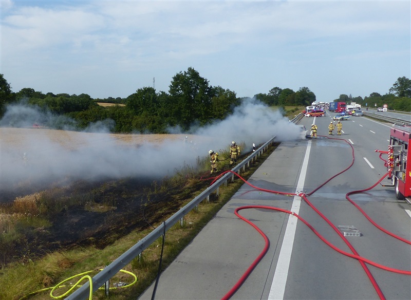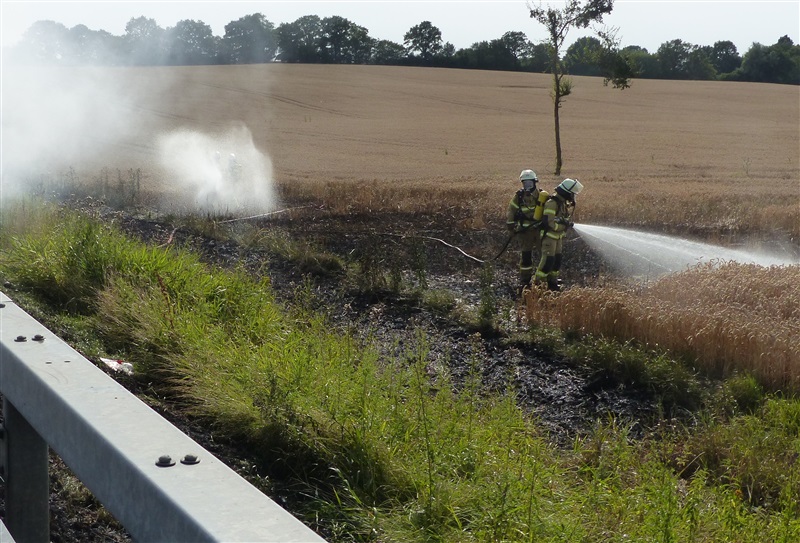 Beim Eintreffen der ersten Einsatzkräfte brannte ein PKW in voller Ausdehnung. Das Feuer hatte sich bereits über den Grünstreifen in ein, noch nicht abgeerntetes, Weizenfeld ausgebreitet. Auf Grund dieser Lage wurde für die Feuerwehr Reinfeld ein zweiter Alarm ausgelöst und die Feuerwehr Bad Oldesloe ebenfalls alarmiert, damit wir an der Einsatzstelle über genügend Löschwasser verfügen. Unter Atemschutz (insgesamt 5 Trupps) und mit 4 C-Rohren sowie einem Mehrbereichsschaum-Angriff wurde das Feuer bekämpft und im Anschluss mit der Wärmebildkamera kontrolliert.
