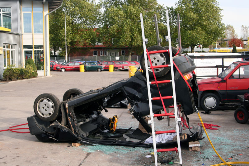 Der Samstag gehörte der praktischen Ausbildung. Den Tag über war auch ein Team des Rettungsdienst-Verbundes Stormarn (RVS) vor Ort, sodass auch die Kommunikation zwischen Feuerwehr und Rettungsdienst bei der Patientengerechten Rettung "trainiert" werden konnte. Neben der "Standard-Lage" - ein PKW auf vier Rädern mit einer eingeklemmten Person - übten die Teilnehmerinnen und Teilnehmer besonders das Vorgehen bei sog. Sonderlagen. Bei den zwei Fahrzeugen in Seiten- bzw. Dachlage war es besonders wichtig, die Autos mittels Steckleiterteilen zu stabilisieren, wie es auf den Fotos auch gut zu erkennen ist.