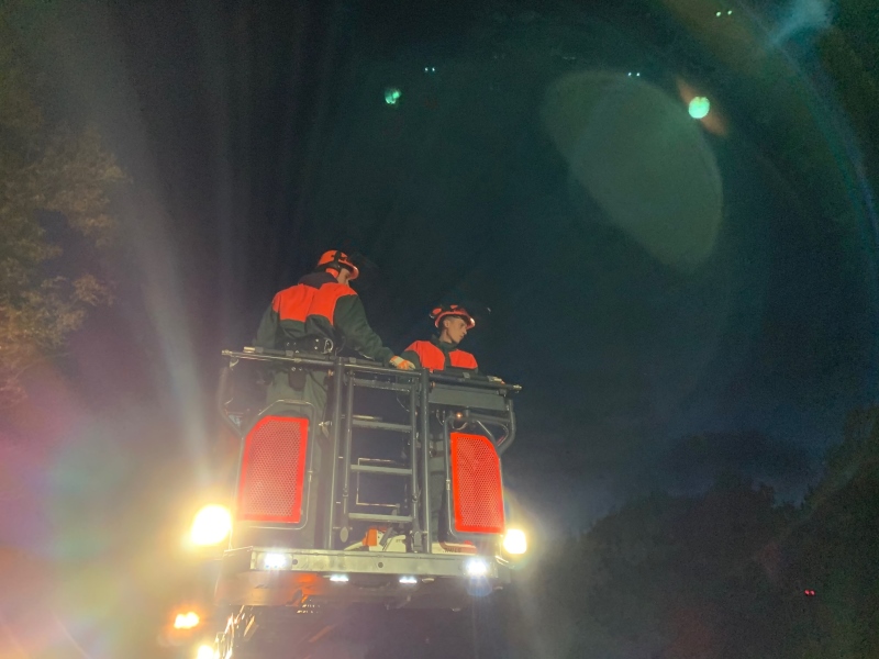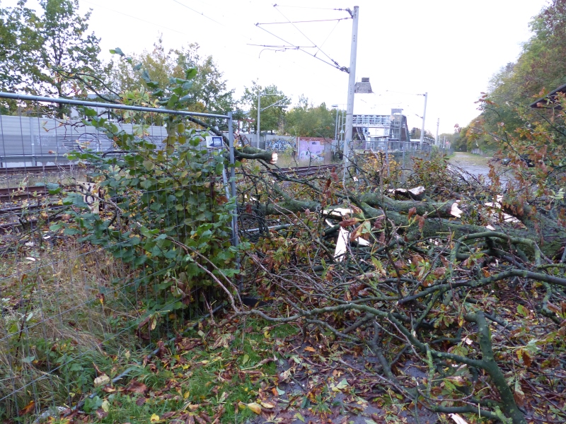 Während eines kurzzeitigen Unwetters fielen Teile einer Kastanie, im Bereich der Verladestraße am Zuschlag, auf ein pakrndes Fahrzeug. Die Krone der Baumteile ragte bis den Gleisbereich der Bahnstrecke Hamburg-Lübeck. Die Einstzkräfte entfernten die Baumteile mittels Motorkettensägen und räumten den Gleisbereich, die Verladestraße und angrenzenden Parkplatz. Anschließend wurde mittels der Drehleiter der Feuerwehr Bad Oldesloe die verbliebenen Kastanienteile abgenommen, um eine Gefährdung durch abbrechende Baumteile auszuschließen. Parallel zu diesem Einsatz arbeiteten die Kameraden den Einsatz Nr. #164 ab.