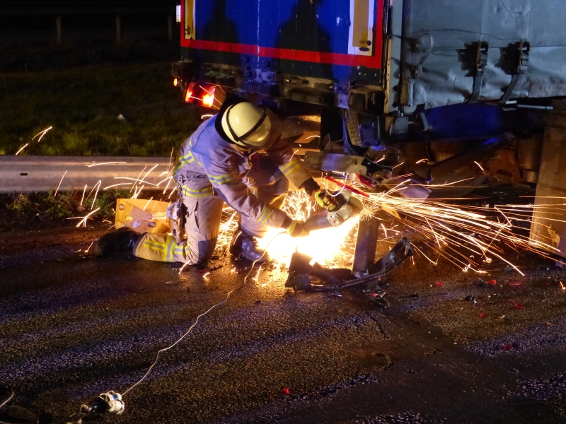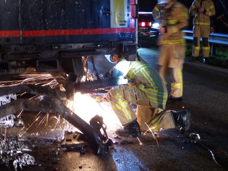 Der beteiligte Auflieger wurde bei dem Unfall schwer in Mitleidenschaft gezogen. Daher leisteten wir mittels Elektrotrennschleifer und Elektro-Säbelsäge anschließend - in Amthilfe für die Polizei - gröbere Karosseriearbeiten, um dessen Abtransport zu gewährleisten.