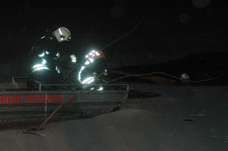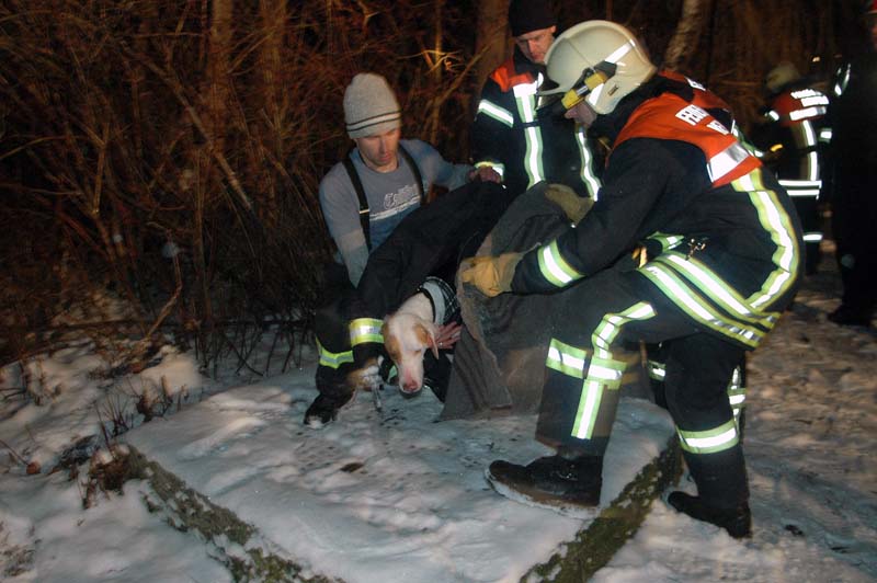 | Ein Hund war bei seinem Spaziergang auf dem Herrenteich etwa 20m vom Ufer entfernt im Eis eingebrochen. Sein Besitzer hatte keine Möglichkeit, an seinen Vierbeiner heranzukommen. Menschen hätte die Eisdecke noch lange nicht getragen. Die alarmierte Feuerwehr Reinfeld bahnte sich mit dem Boot einen Weg durch das Eis. Rechtzeitig konnten die Helfer den erschöpften und unterkühlten Hund retten und seinem Herrchen an Land übergeben. |
