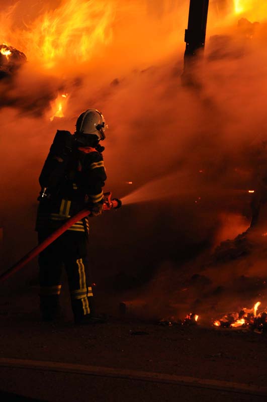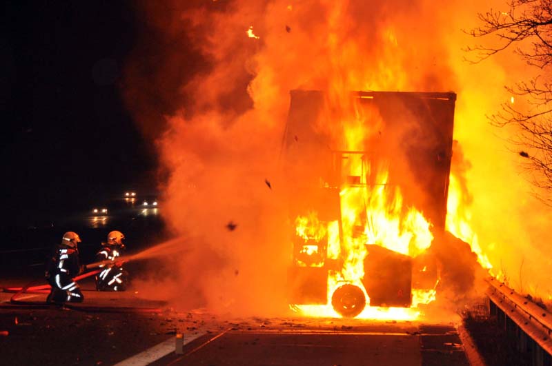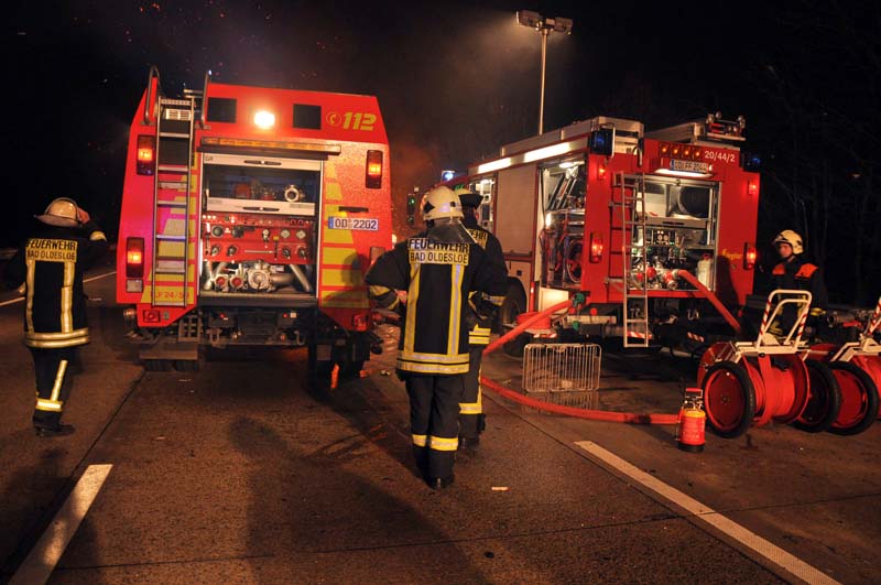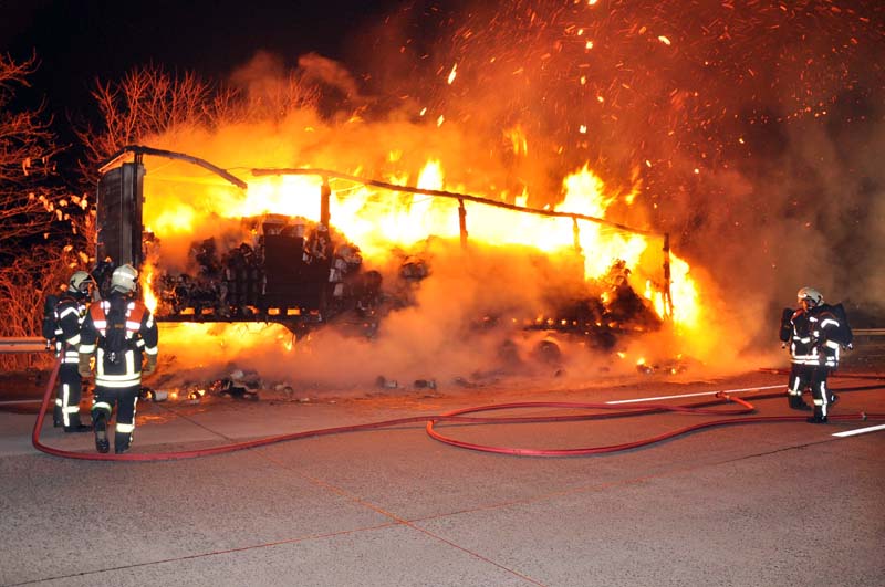 Die Feuerwehr Reinfeld wurde zu einem brennenden Sattelauflieger auf die Autobahn gerufen. Bei Eintreffen der ersten Kräfte stand der mit Zellstoff beladene Anhänger bereits im Vollbrand. Mit Unterstützung der Feuerwehren Bad Oldesloe, Hamberge und der Berufsfeuerwehr Lübeck wurde das Feuer gelöscht. Fotos: Arne Mundt |