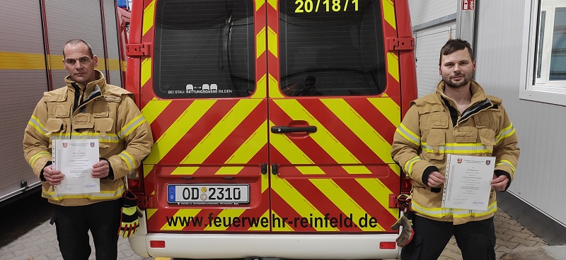 Nach der erfolgreichen Abschlussprüfung ihrer Grundausbildung am heutigen Montag, sind beide Kameraden vollwertige Mitglieder unserer Einsatzabteilung.